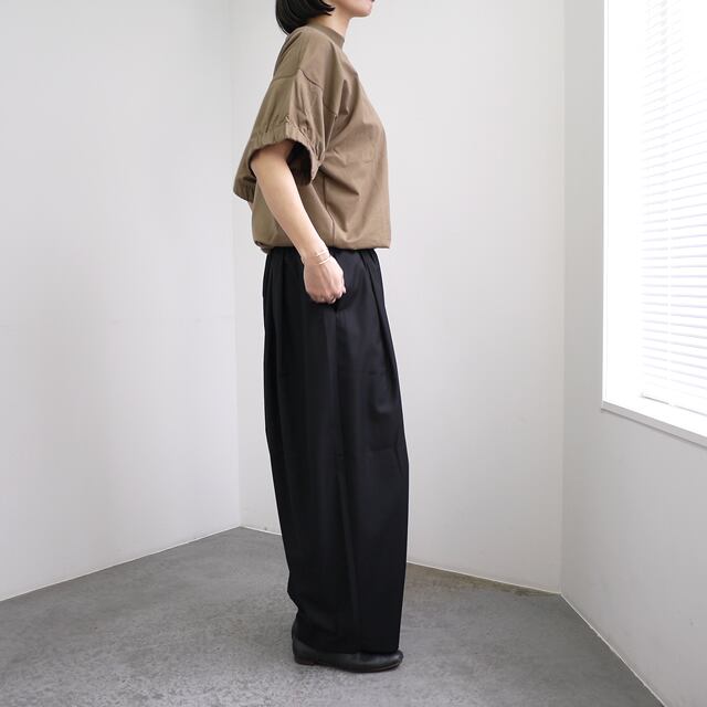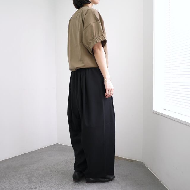 ゆったりとしたドレープ感が印象的なTシャツドレス。柔らかな着心地のコットン素材で快適な着心地です。ベーシックなクルーネックに、たっぷり広がるシルエットのコンビネーションが着こなしのポイントです。ギャザー使いになった袖のデザインも印象的。やや肉厚なカットソー素材で着やすい生地感となっています。