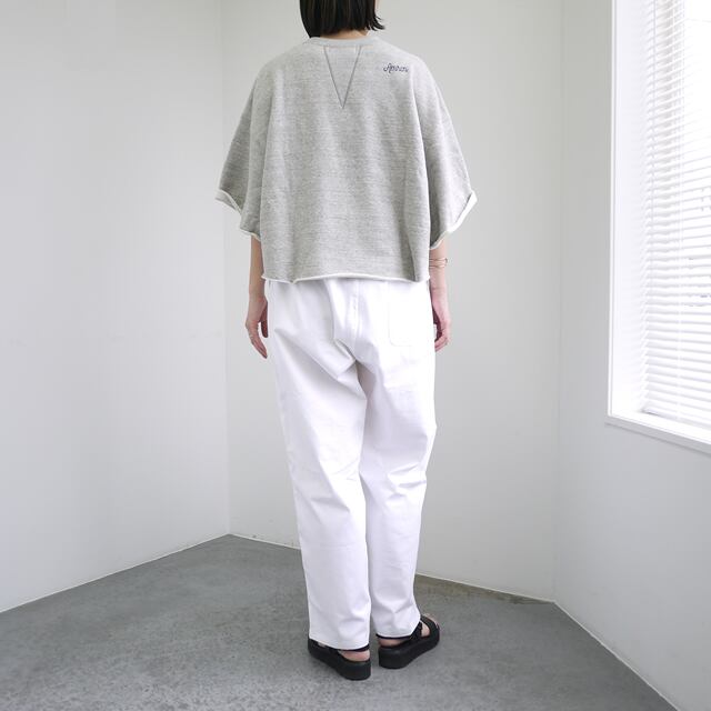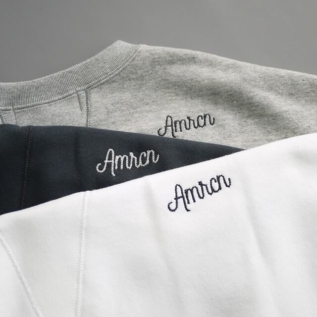 切りっぱなしのデザイン袖と裾が印象的なワイドスウェットプルオーバー。素材にはアメリカーナオリジナルの無燃糸裏毛を使用しています。表の糸はコーマ糸を使っており表面の目面は非常に綺麗。裏糸には無燃糸タイプの糸を使用しているため、非常にソフトでフワリとボリュームのある生地に仕上げられています。ワイドな身幅に太目の袖をカットオフ仕様に。背中のロゴ刺繍も着こなしのアクセントになっています。