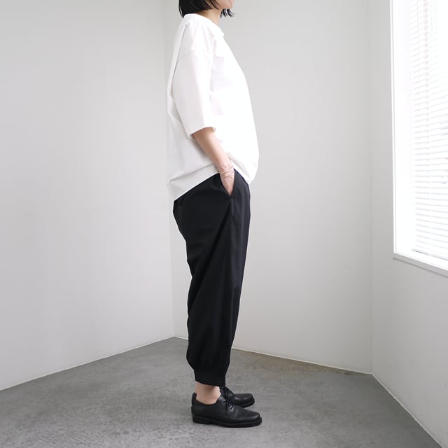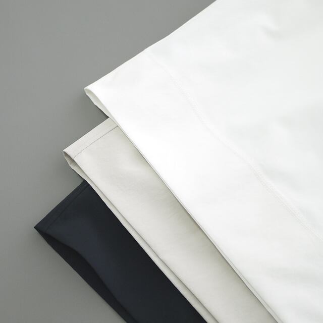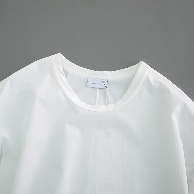 オーバーサイズデザインの5分袖クルーネックプルオーバー。光沢のないストレッチ性のあるポリエステル糸を使用した平織りタイプライター生地。透けにくい糸を高密で織っているため淡色でも透けにくくストレッチもよく効いているため、とても着やすい生地感です。速乾機能もあるので扱いやすく、上品ながらデイリーにお使いいただけます。