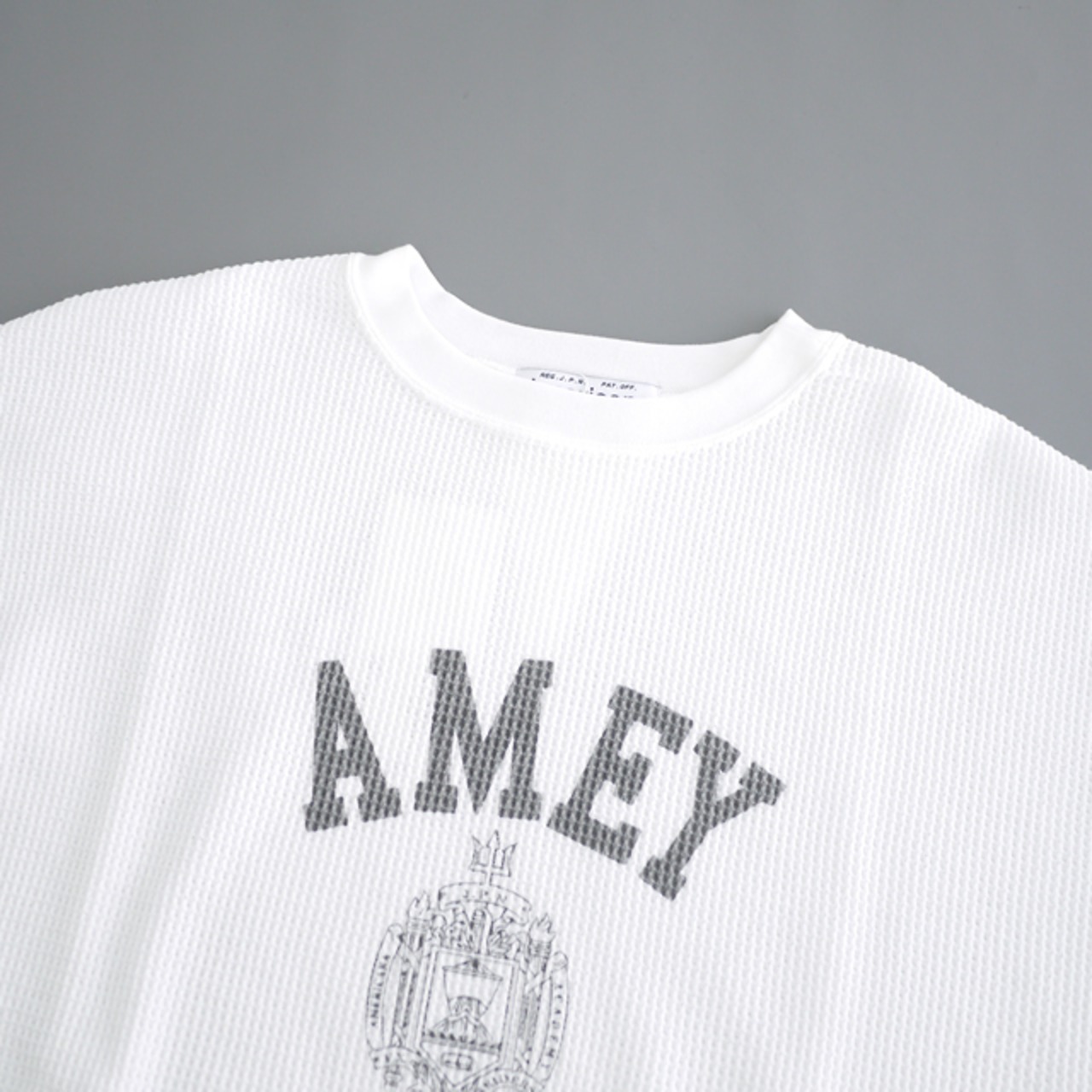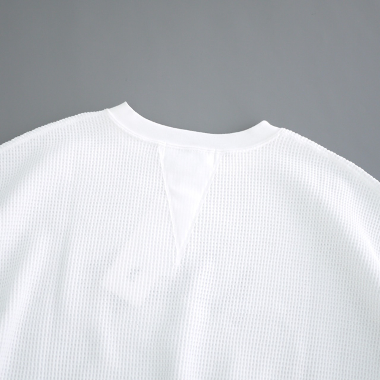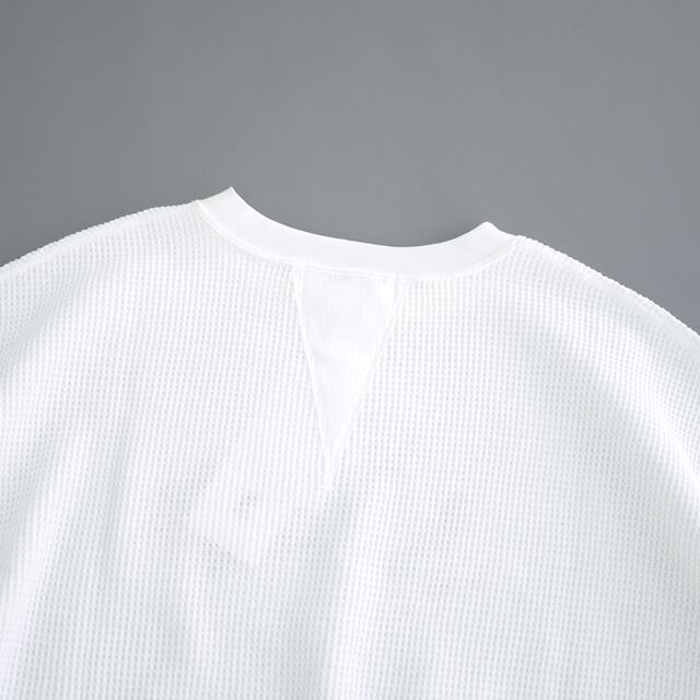 フロントのプリントと首後ろのVガゼットがデザインポイントのワッフルTシャツ。ワッフル生地には、ドライタッチが特徴の空紡糸が使われています。さらりとして肌離れも良く、汗ばむ季節でも快適に着用できます。左裾にロゴパッチ、裾は裁ち切り仕様となっています。