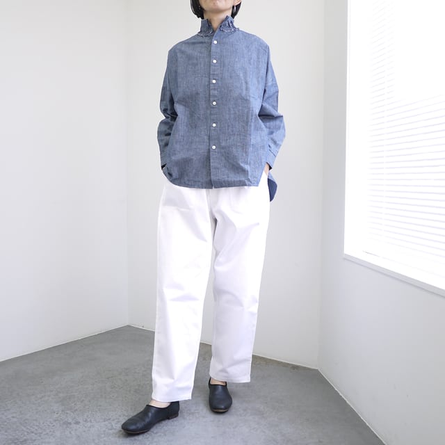 ナチュラルな風合いと程よいハリ感が特徴のシャンブレー素材を使用したラッフルシャツ。女性らしいラッフルカラーになった首元のデザインが印象的。カジュアルに羽織ってもタックインにもお使いいただきやすい着丈で、シーズンを問わずにお使いいただけます。