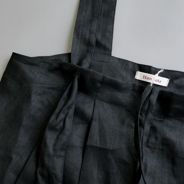 ホルターネックが特徴的なオーバーオール。首元にかかるリボンがポイントとなっています。サイドにはファスナーがついているので着脱も簡単。肩紐は結ぶ仕様で長さを調整していただけます。素材には、ヴィンテージ感のあるネップの雰囲気が印象的なフレンチリネンツイル素材を使用。微光沢で上品な表情が特徴です。ハリ感を残しつつ、使い込むうちに柔らかくなるリネン特有の風合いを活かした一着に仕上げられています。
