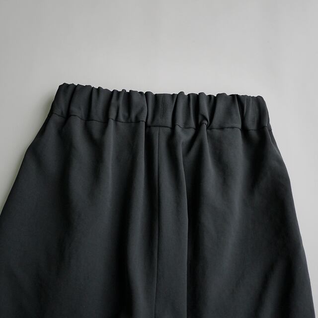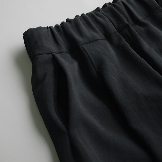 光沢の無いポリエステルの追撚糸を使用した、ドライタッチで落ち感のある素材を使用。風合いを出すための皺加工を施しているのでポリエステルでありながらナチュラルな風合いを併せ持っています。シャリ感と落ち感を合わせ待ち適度な重量感もあるので服のラインをとても美しく見せてくれます。