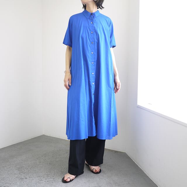 肌触りがなめらかで、見た目にも上品な風合いが魅力のハーフスリーブシャツワンピース。薄手ながら適度なハリとコシを持つ60ローン素材を使用し、軽やかでありながらしっかりとしたシルエットをキープします。レギュラーカラーから裾まで続くボタンデザインで、1枚でワンピースとして着るのはもちろん、ボトムスとのレイヤードスタイルもおすすめ。ふんわりと広がるフレアラインが、清楚で女性らしい印象を演出します。