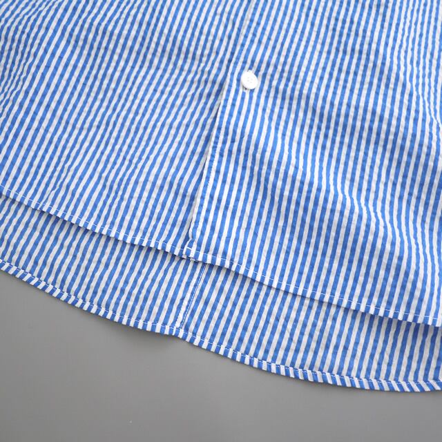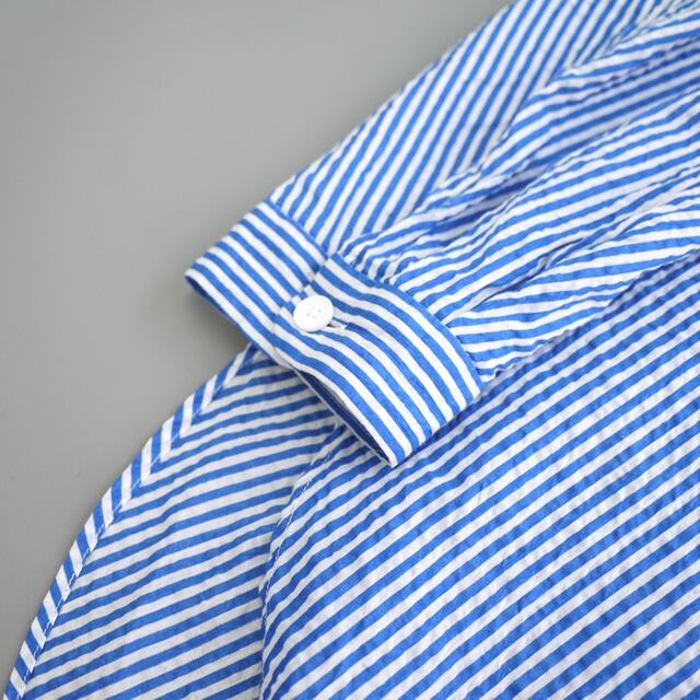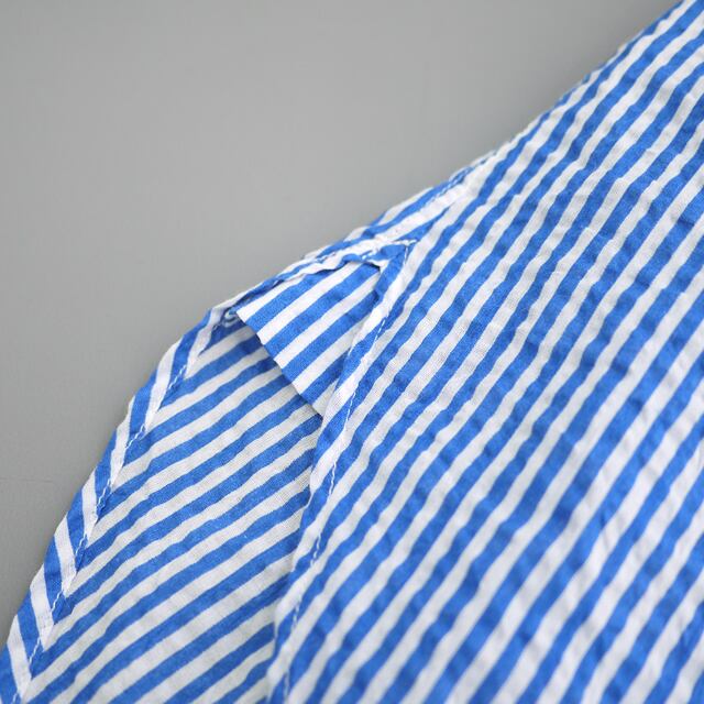 80番手の細番手ローン生地にストライププリントを施し、仕上げに独自の糊付け加工を加えることで、程よいハリとコシ、上質な風合いを実現。この糊付け加工は洗濯後も持続し、着用を重ねるごとに徐々に柔らかく、体になじんでいきます。裾は動きのあるラウンドヘム仕様で、脇にはガゼット(補強布)を配し、機能性とデザイン性を両立。シンプルながら素材の質感が際立つ、大人のカジュアルスタイルにおすすめの一着です。