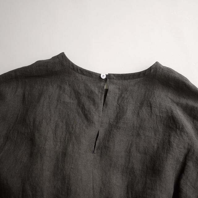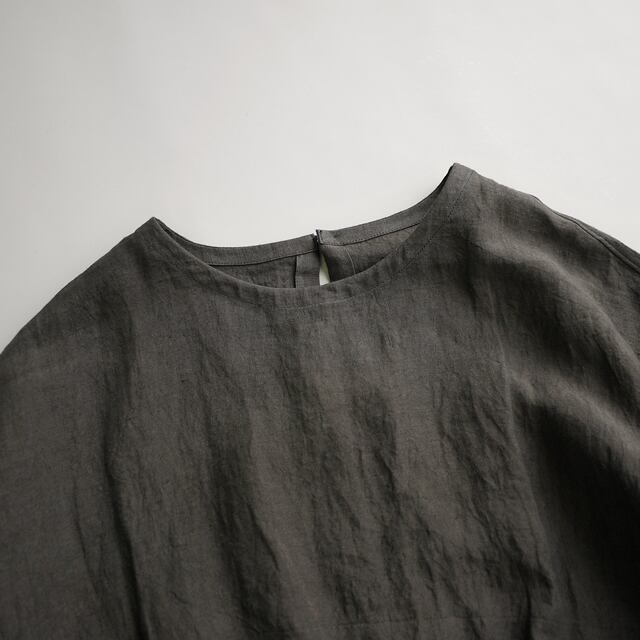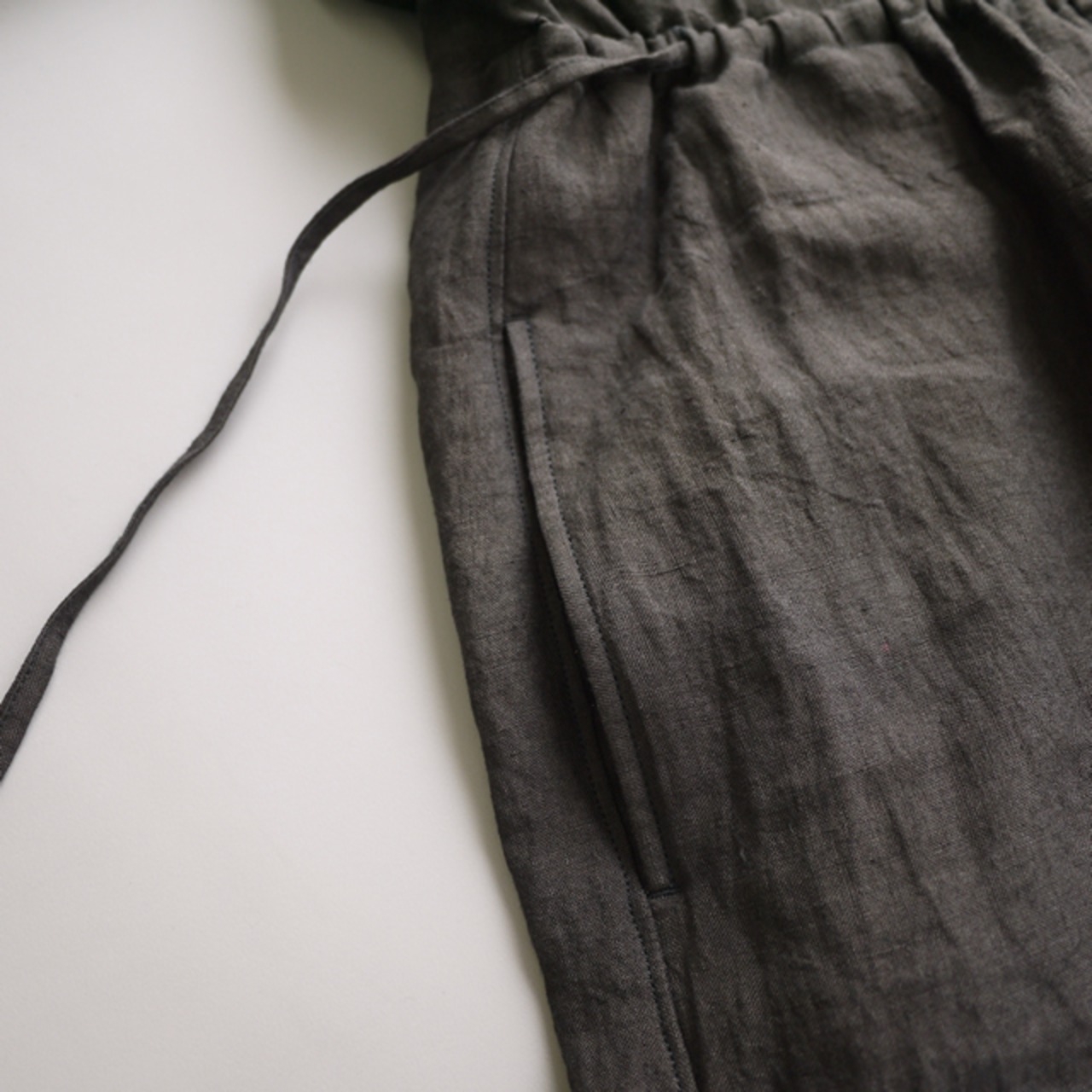 上質な60リネンポプリン素材を使用した、涼やかな着心地のクルーネック半袖ワンピース。前ウエストにはゴムシャーリングと共布のスピンドルを配し、ナチュラルなフィット感とシルエットのアレンジを楽しめるデザインに仕上げられています。後ろ裾には深めのスリットを入れることで、動きやすさとともに、見た目にも軽やかな清涼感をプラス。シンプルながらもさりげないディテールが際立つ、大人のリラックススタイルにぴったりの一着です。