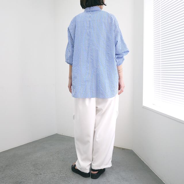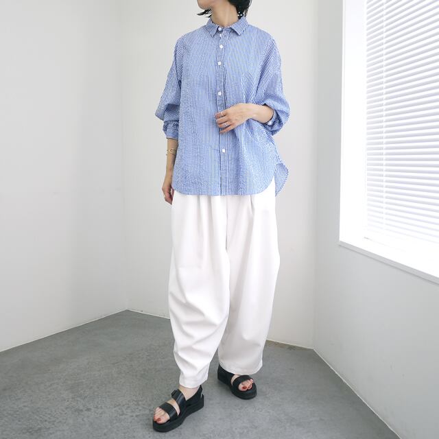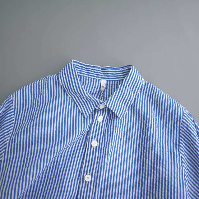軽やかな80番手ローンにストライププリントを施し、製品仕上げ後に特別な糊付け加工を施すことで、程よいハリ感と立体的な風合いを加えた一枚。洗濯してもこのハリ感は保たれ、着用を重ねるごとに柔らかく身体になじんでいきます。襟元はクラシックな台襟付きシャツカラーで、きちんと感を演出。袖はスプリットラグランとピボットスリーブを組み合わせた独特なパターンで、動きやすさと立体的なフォルムが魅力です。