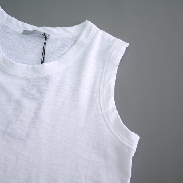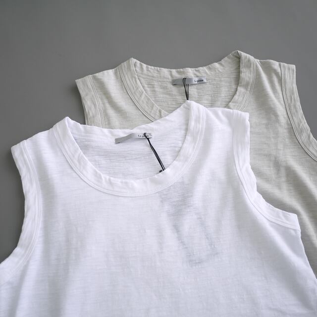 ムラ糸天竺のタンクトップ。表面のムラ感に表情があり、とても柔らかで着心地の良いシリーズです。衿ぐりの太めのパイピングがデザインの特徴に。一枚でももちろん、ワンピースやブラウスのインナーとしても重宝します。