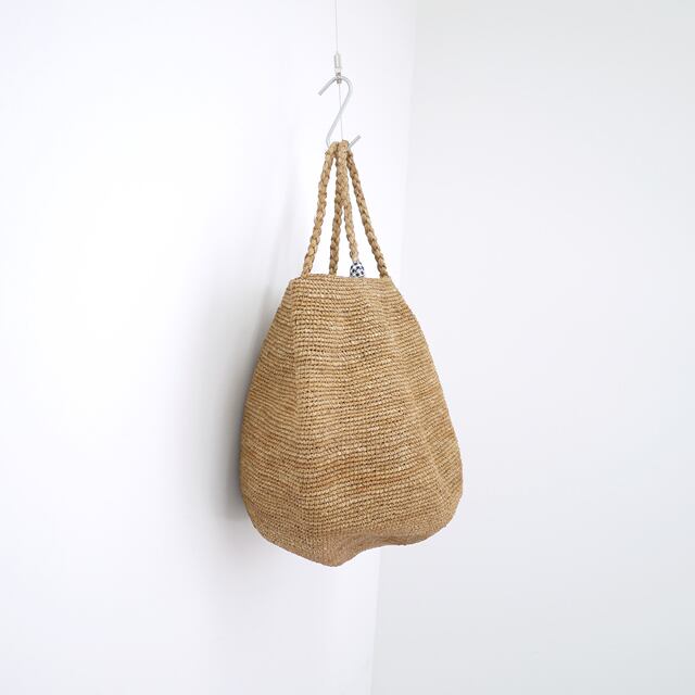 バッグの底にはしっかりとマチを取り、深さもたっぷり確保しているため、見た目以上に収納力があり、日常のお出かけにはもちろん、ピクニックやリゾートシーンなど、さまざまな場面で活躍します。使い込むほどに素材がなじみ、ラフィア特有のやわらかさと色合いの変化を楽しめるのも、このバッグならではの魅力です。