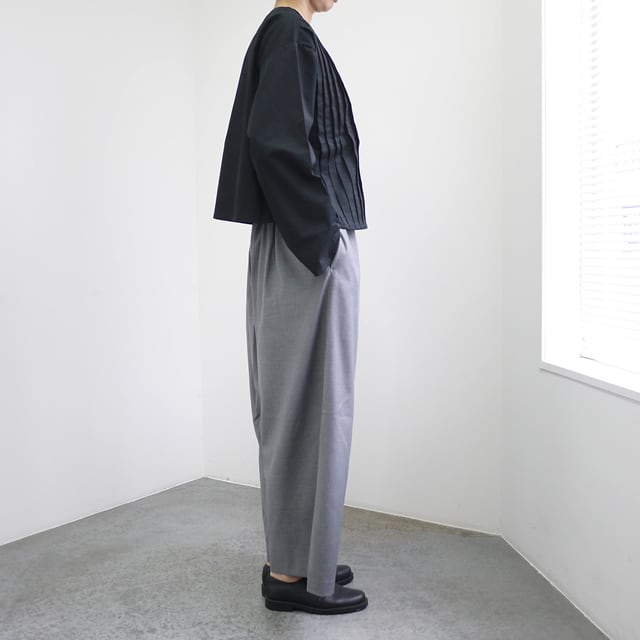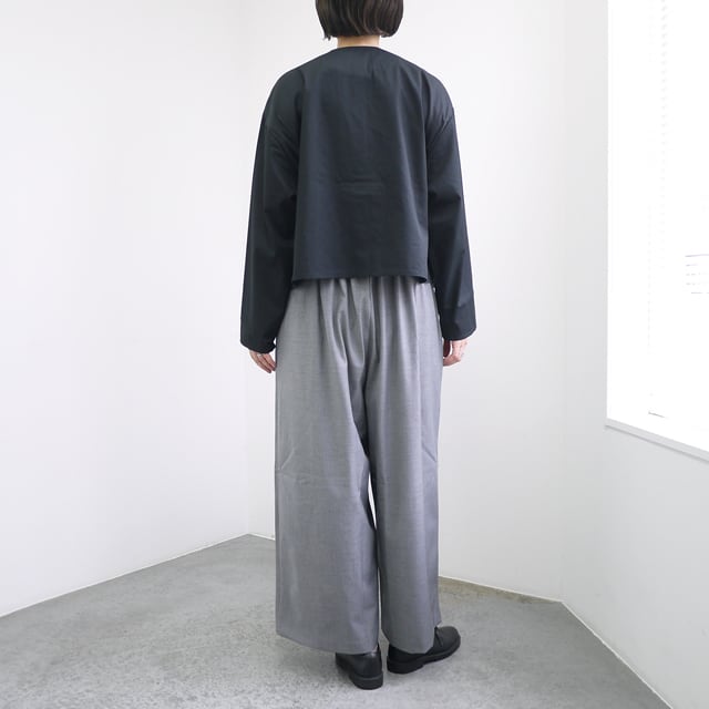 フロントのピンタックが印象的なノーカラーシャツ。ボタンが見えない比翼仕立てがデザインの美しさを引き立てます。片側に配したポケットがさりげないアクセントに。袖口にカフスがないので、軽やかに着こなせ、ロールアップも簡単。ワイドでショートな丈感は、ボリュームのあるボトムスとも相性抜群です。
