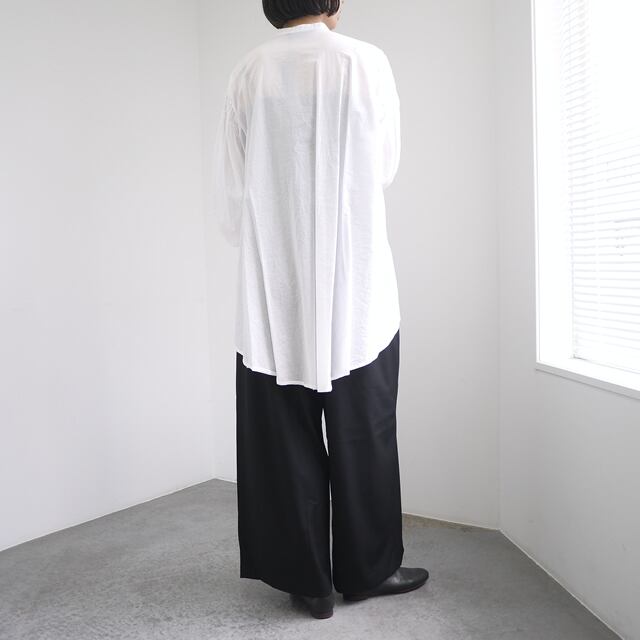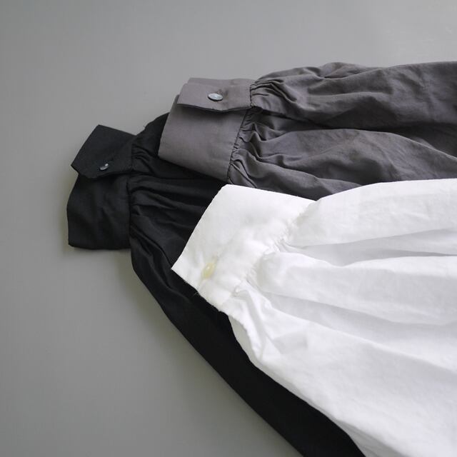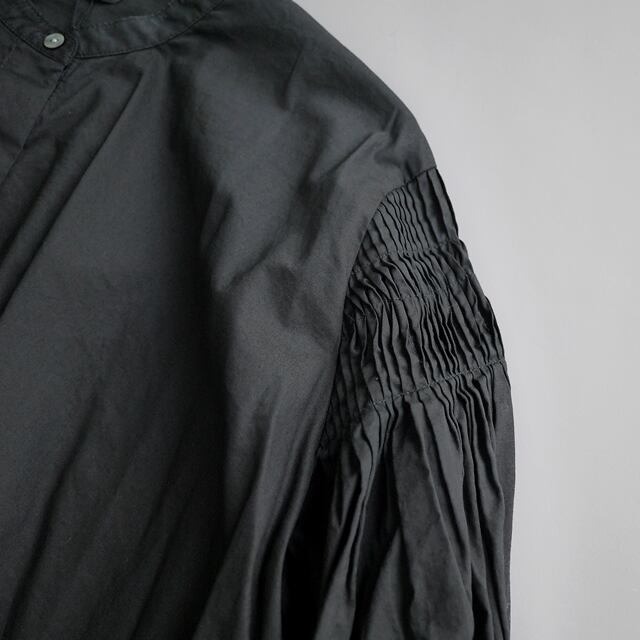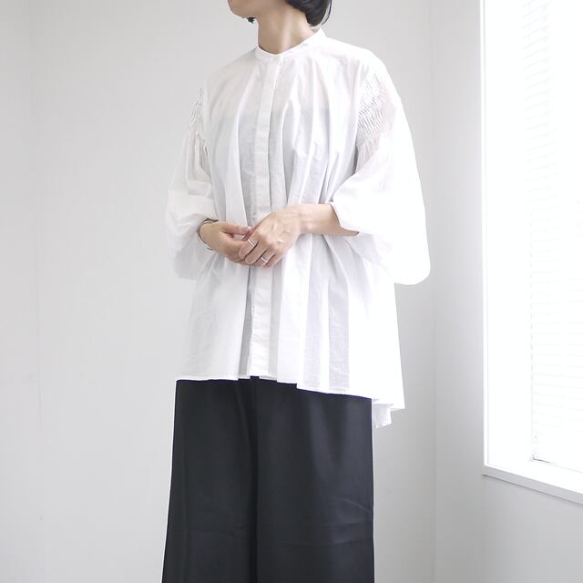 繊細なピンタックを肩下袖の一部分に施したデザインで、ピンタックのふんわりとしたパフスリーブ袖を演出するパフスリーブシャツ。バンドカラーの首元から比翼仕立てのフロント面はすっきりと、より袖のデザインを印象的に表現した一着です。前後差を付け滑らかにカーブした丸みのある裾回りがデザインのポイントになっています。