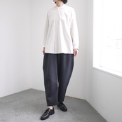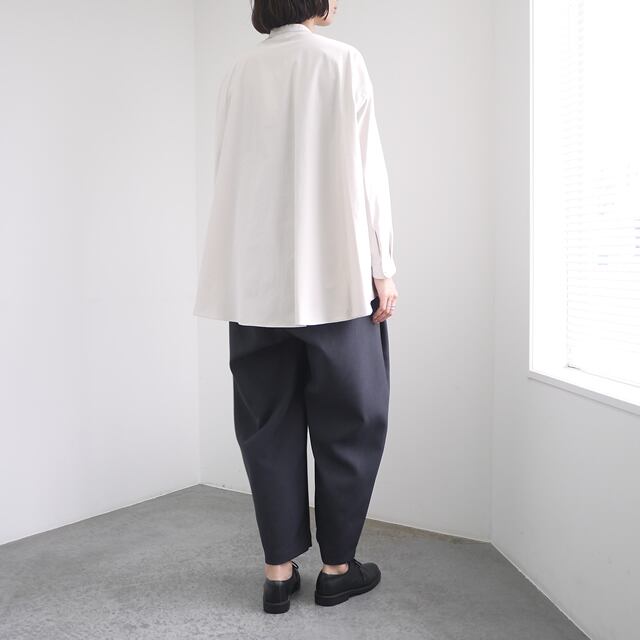 光沢のないストレッチ性のあるポリエステル糸を使用した平織りタイプライター生地を使用。透けにくい糸を高密で織っているため淡色でも透けにくくストレッチもよく効いているため、布帛仕立て・カットソー仕立てどちらでも対応できる生地です。速乾機能もあり季節を問わずにご着用いただきやすい一着となっています。肩周りや袖はすっきりと、身幅にゆとりを持たせたバックフレアシルエット。