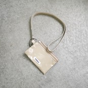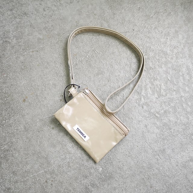 斜めがけができる長さのストラップ。 フラットポーチや鍵、キーケースなどを丸カンに通して身につけて持ち運びできます。生地にPVCコーティングを施し、防水性、耐久性を保たせています。