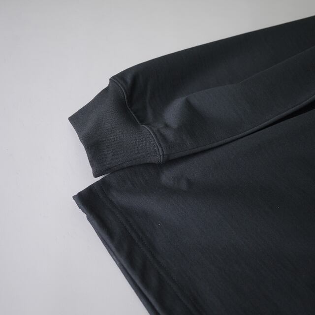 表と裏で異なる糸を使い分けることで、他にない着心地と風合いを実現。表にはコットンニットのようなクラシックな表情のポリエステル糸を、そして肌に触れる裏側には、バネのような伸縮性を持つ特殊なストレッチ糸を使用。これにより、ふっくらとした厚みとハリ感を保ちつつ、驚くほど動きやすく快適な着心地に仕上がっています。