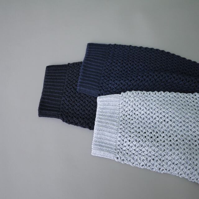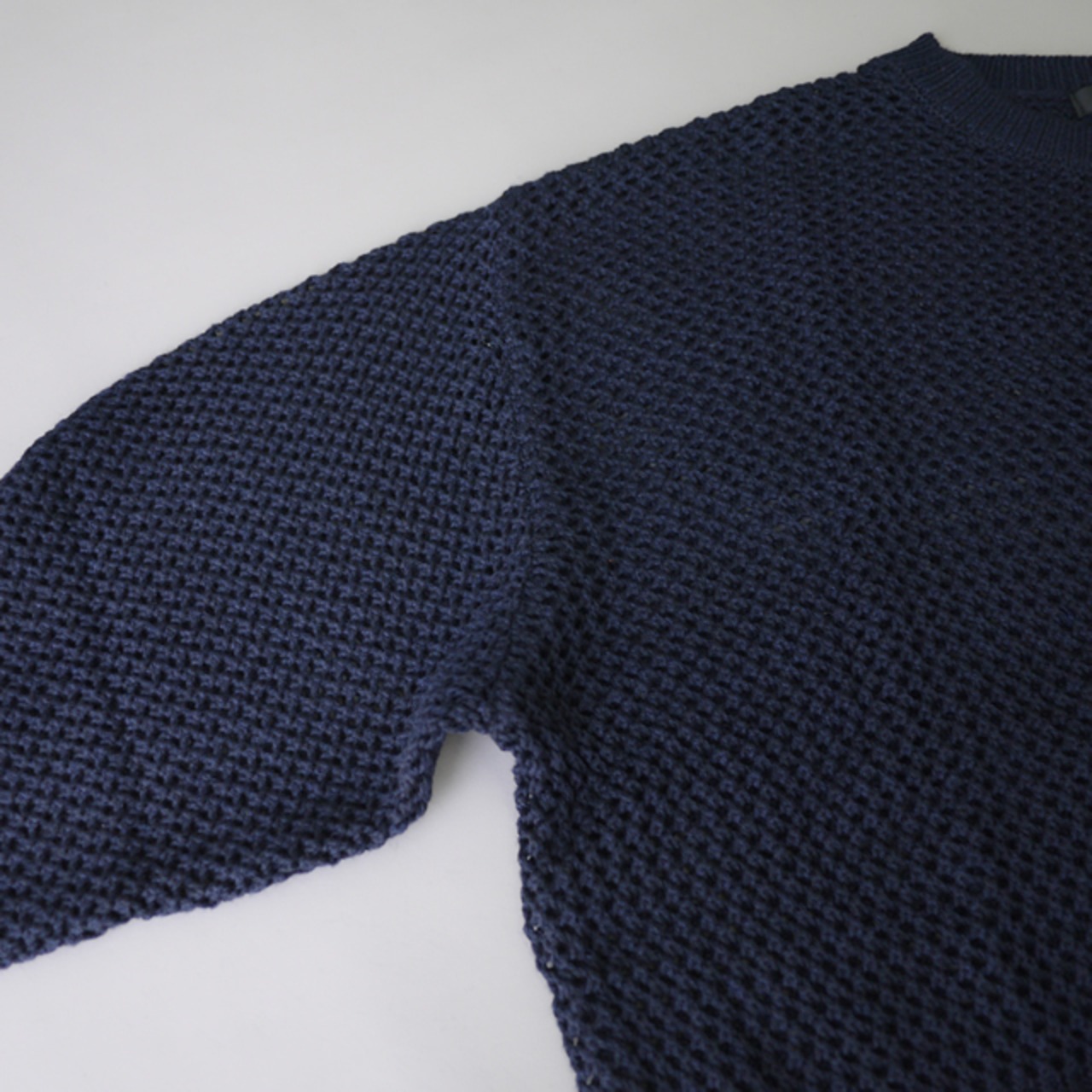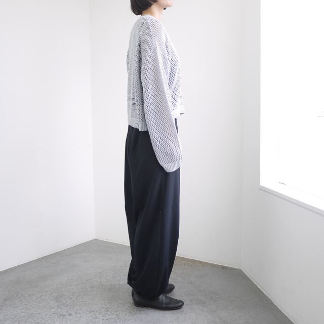 ざっくりとしたかぎ編みの透かし模様が印象的なニットプルオーバー。コンパクトな着丈と、ほんのり長めの袖丈が絶妙なバランス。インナー次第で様々な表情を見せてくれる、着こなしの幅が広がるアイテムです。