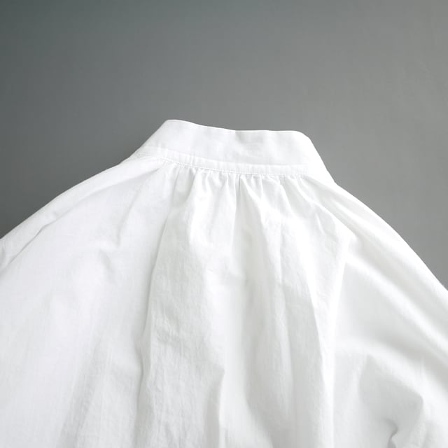 くったりと柔らかなコットン100%素材が心地よい、大人のためのスタンドカラーシャツ。首周りに施した繊細なギャザーが、さりげないアクセントとなり、一枚で着るだけで顔周りを華やかに見せてくれます。程よくゆとりのあるサイズ感と、ニュアンスが出る袖口のデザインが、シンプルながらもこなれた雰囲気を演出します。