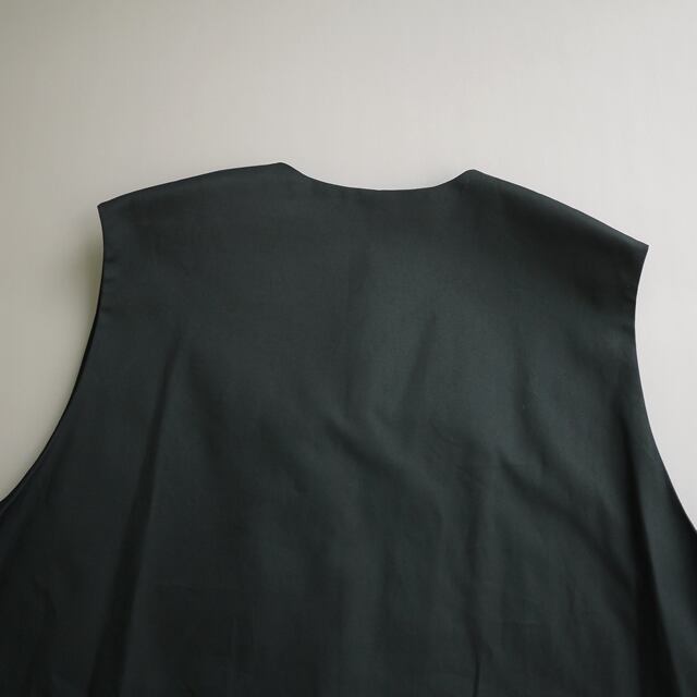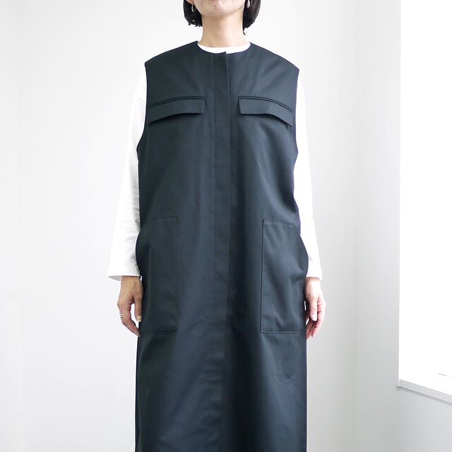 クルーネックのすっきりとした首元と、ゆとりのあるアームホールのおかげで、シャツや厚手のニットをインナーにしてもごわつきません。比翼仕立てのフロントを閉じれば、ジレとしてだけでなく、ワンピースのようなスタイリングも可能。
