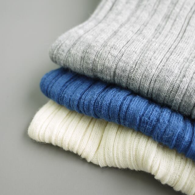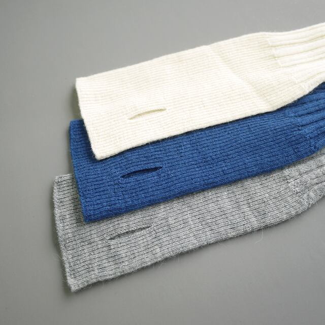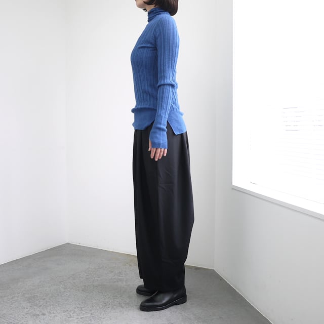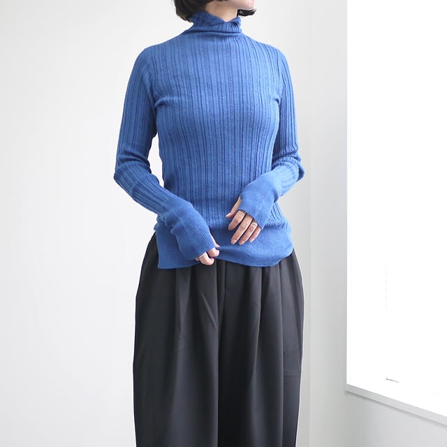 ペルーの標高3500~5000mの高地で飼育されるラクダ科のアルパカには大きく2つの種が有り、通常のアルパカとその10分の1くらいの数とされているスーリー種があります。スーリー種の毛質の特徴は光沢があり非常にしなやかでなめらか。こちらは、その100%ベビースーリーアルパカで編んだランダムリブニット。スリットの入った上部を少し折り返すハイネックで、長めの袖口には親指を通すホールを開けています。フィットしすぎないシルエットがインナーとしてもそのまま一枚でも着用できる便利なアイテムです。