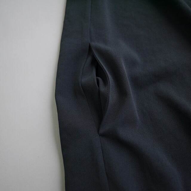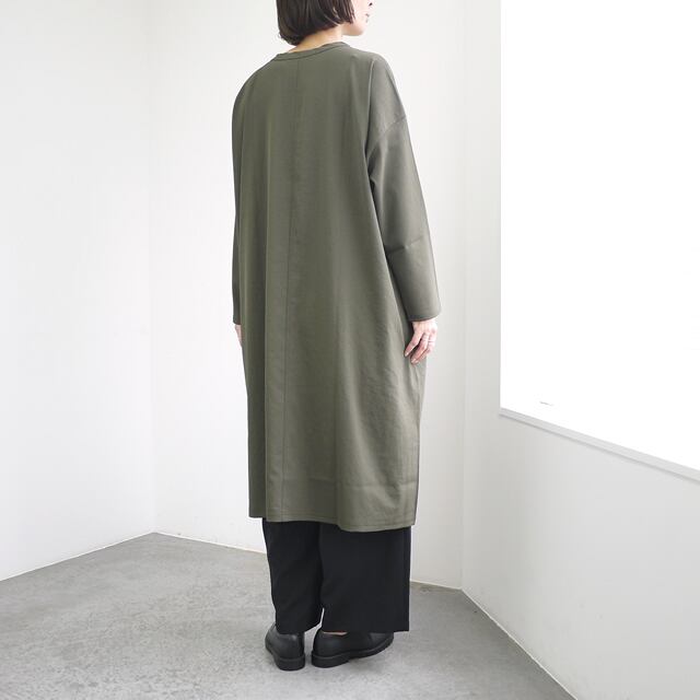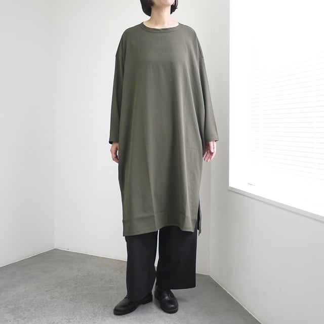 ややストレッチ性のあるポリエステル糸を平織りにした生地を使用したワンピース。透けにくい糸を高密で織っているため淡色でも透けにくく、またストレッチ性があるため、着用時のストレスもなく快適な着心地。パンツを合わせた着こなしも相性抜群。シックな秋冬の装いにお勧めのワンピースです。