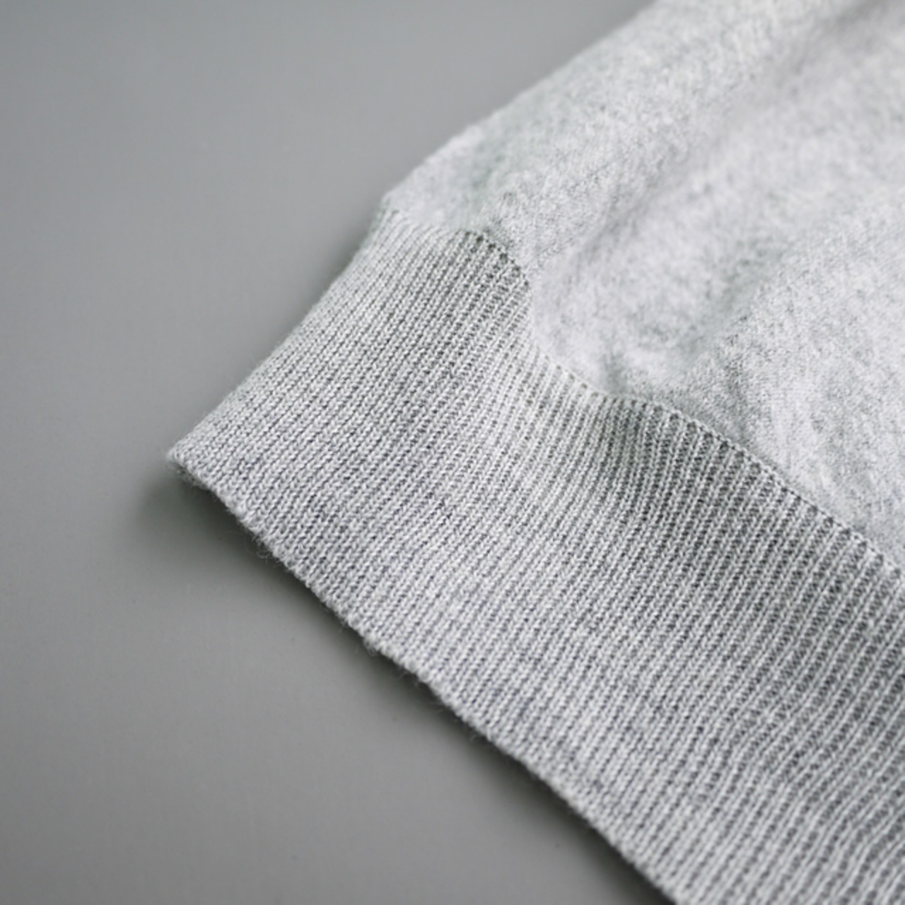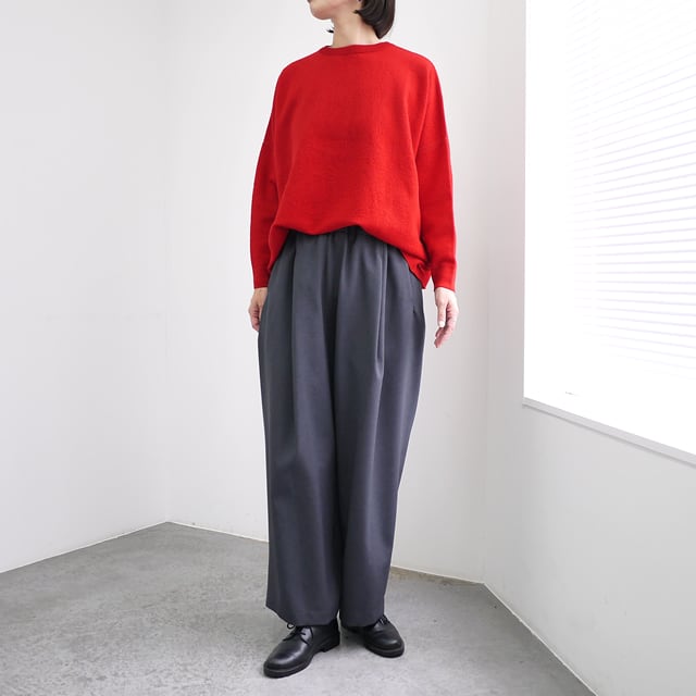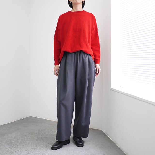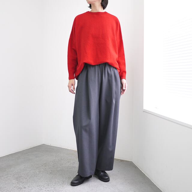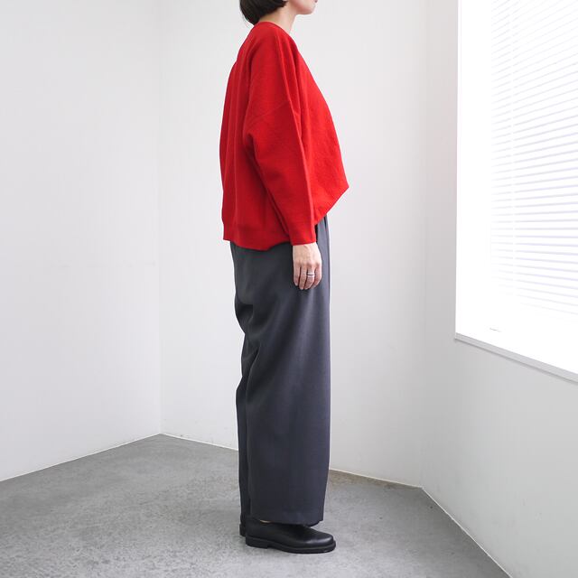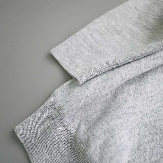 たっぷりとした身幅からのドレープが特徴のバーバーニット。目の程よく詰まった縮毯ウールを使い、暖かな一着です。縮絨を行うことで生地に軽さがありながらも暖かさは損なわずに着ていただけるニットになっています。肩の落ちたドロップショルダー、身幅にたっぷりとゆとりを持たせたワイドシルエットでリラックス感があります。