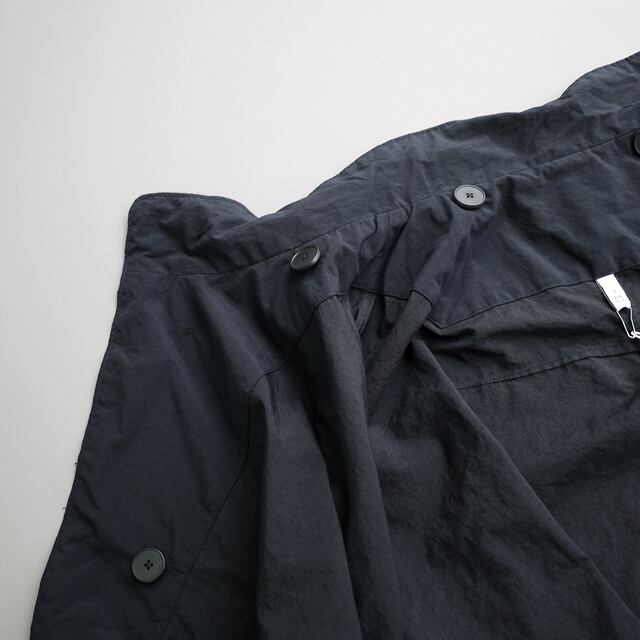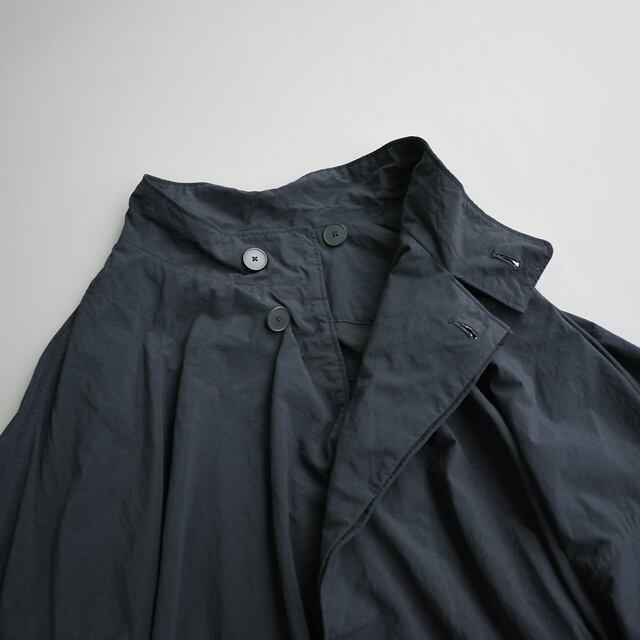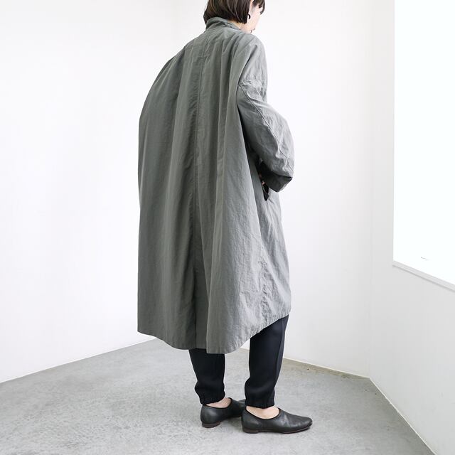 フィルマムで定番となっているオーバーサイズのスタンドカラーコート。デザインは肩周りや身幅、袖幅に大きくゆとりを持たせたゆったりとしたシルエットです。ウエストに配したドローコードを絞る事でシルエットをアレンジ可能。背面の裾にはフィッシュテールデザインになっています。