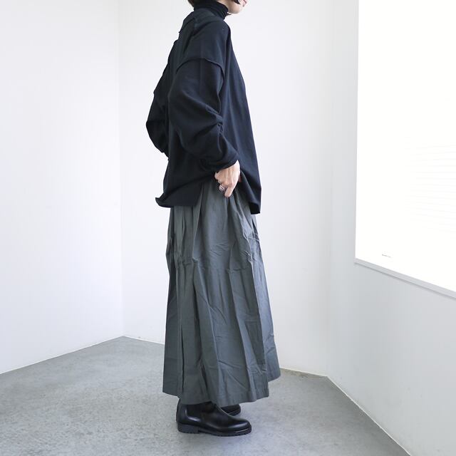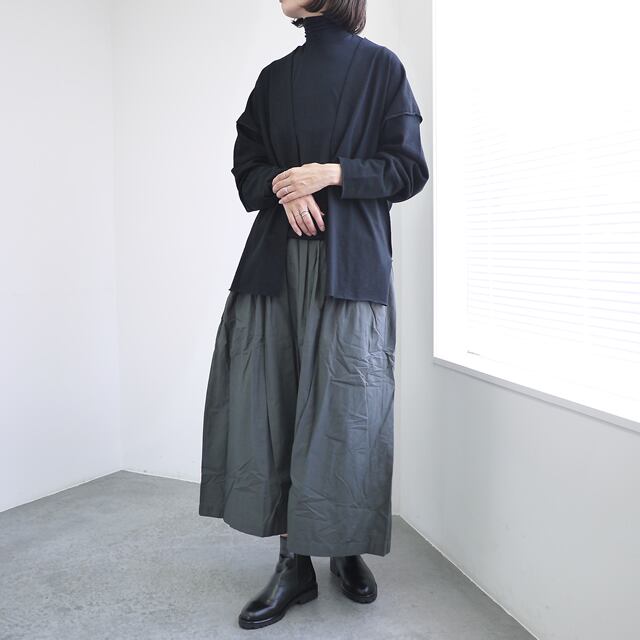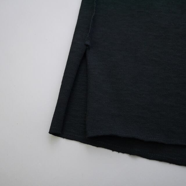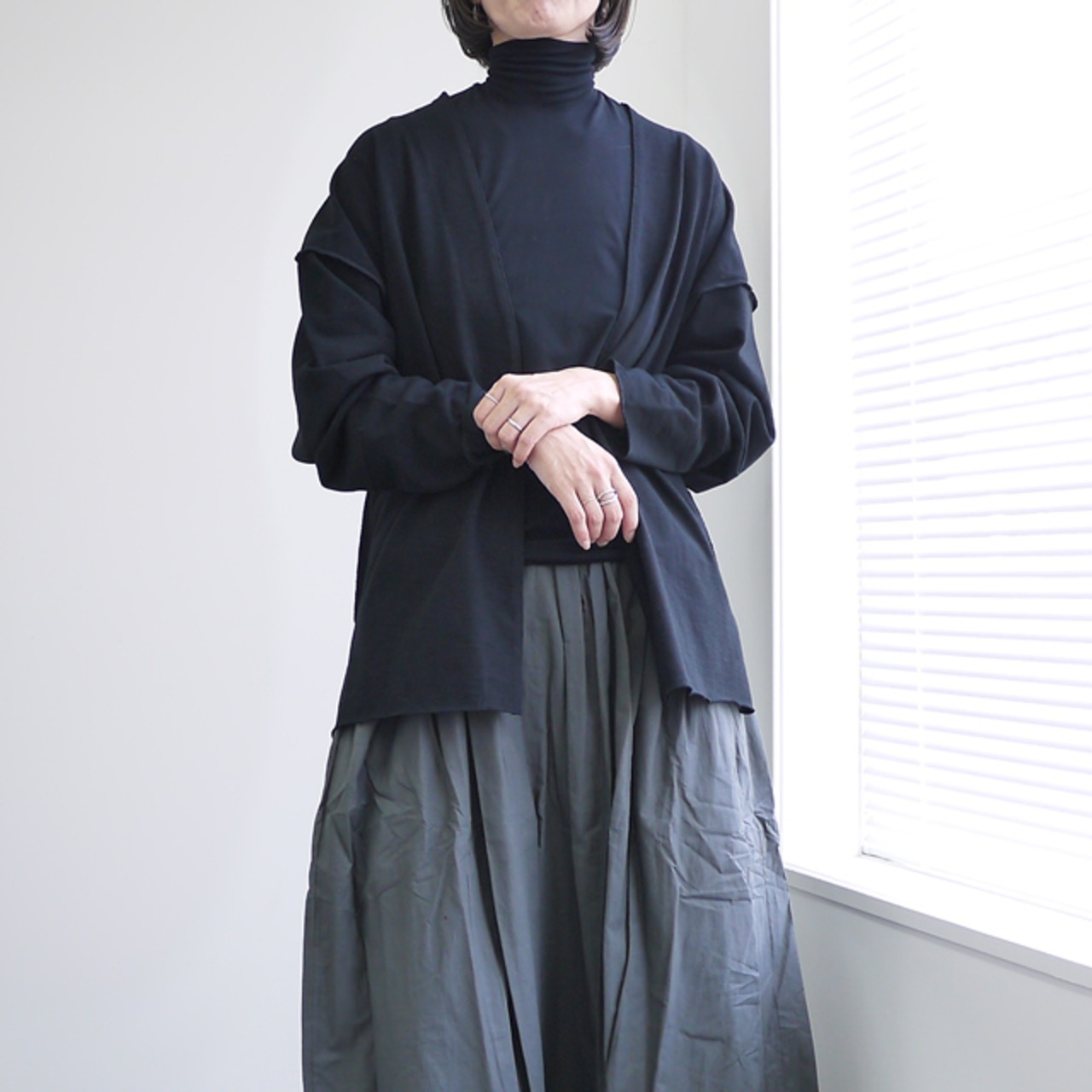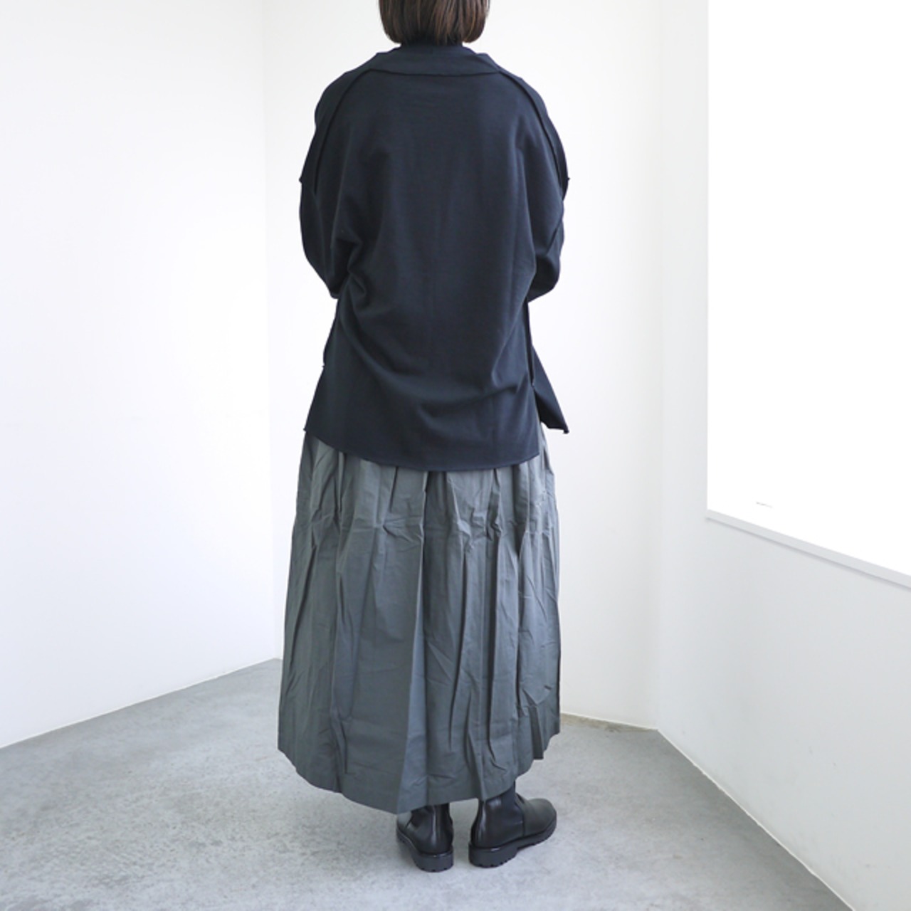 あえて縫い目を表に出した縫製仕様が特徴。また、ドロップショルダーでリラックス感のあるシルエットもポイントです。裾には前後に段差をつけたスリットを入れ、さりげないアクセントになっています。