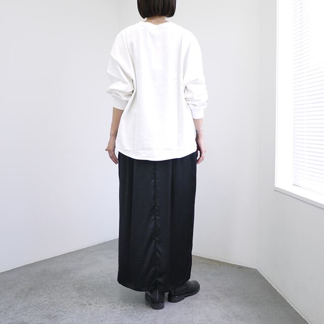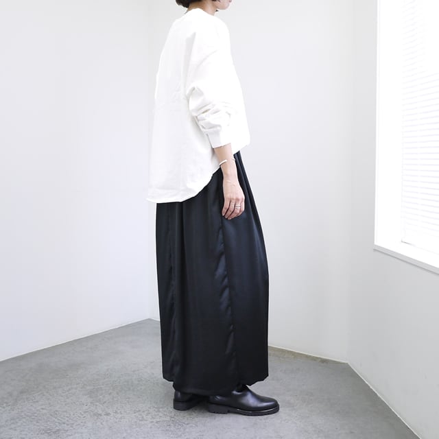 ゆったりとしたシルエットに、裾の切りっぱなしデザインとゆるやかなカーブを描くラウンドヘムが特徴。サイドに配されたリブの切り替えが、シンプルな中にもさりげないアクセントを加えています。