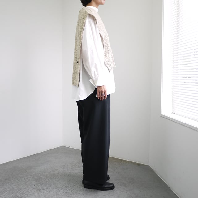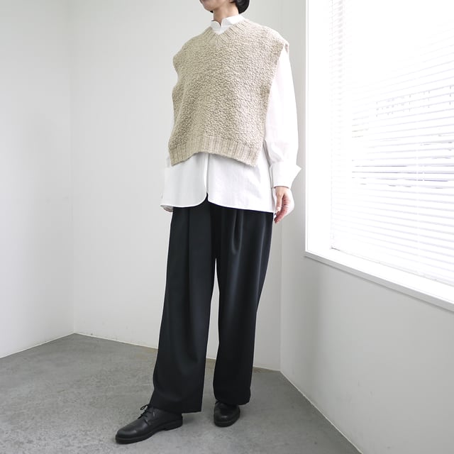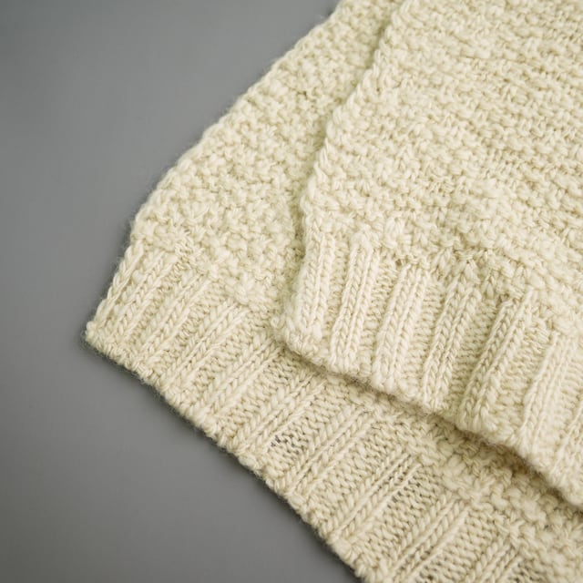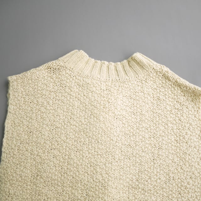 バルキー性の高いウールで作り出した素朴なスラブ形状と、2本取りの3G梨地編みによって、独特な凹凸感のある表情に。