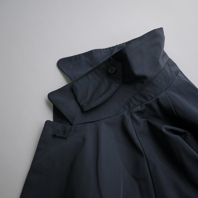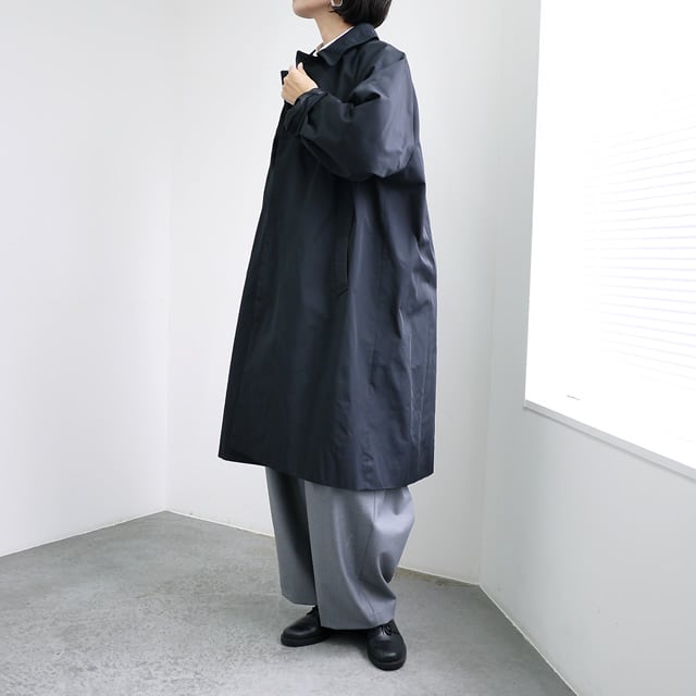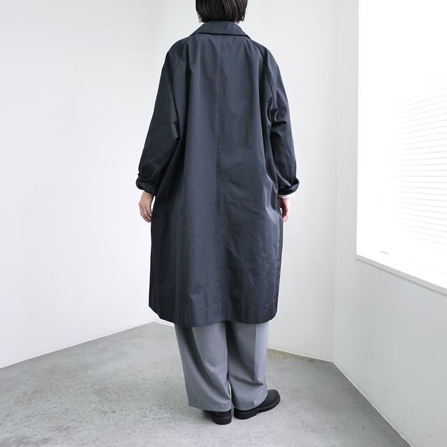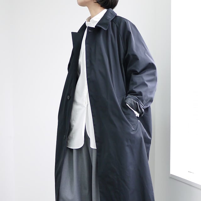 形状記憶機能を持つ強撚ポリエステルを綾織りした、厚手のギャバジン素材を使用したステンカラーコート。強くコシのある生地が生み出す、独特なおおらかなシワ感が特徴です。鈍い光沢と相まって、雰囲気のある表情を見せてくれます。