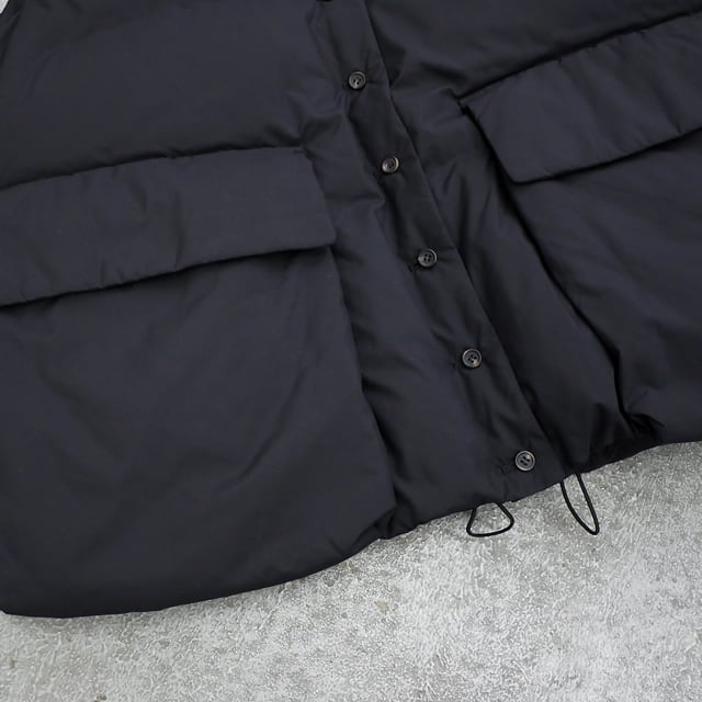 ボリューム感のある立体的なシルエットが魅力のダウンベストです。フロントに配置された大きなポケットは、デザイン性と実用性を兼ね備え、サイドからも手を差し込める仕様になっています。裾にはドロストコードが通されており、絞ることで丸みを持たせたり、ラフに着こなしたりと、シルエットを自在にアレンジ可能です。