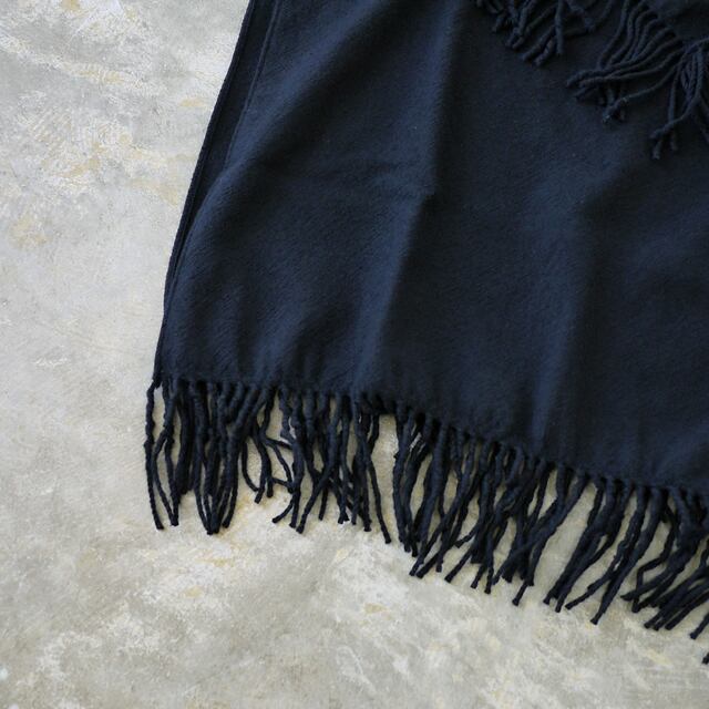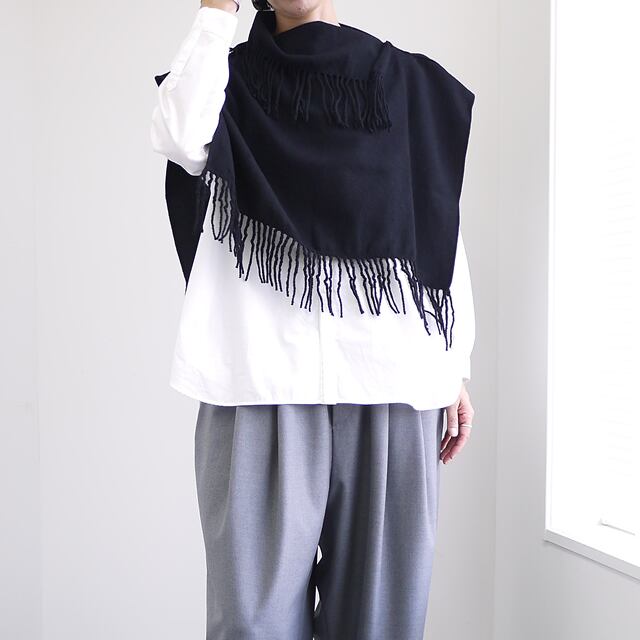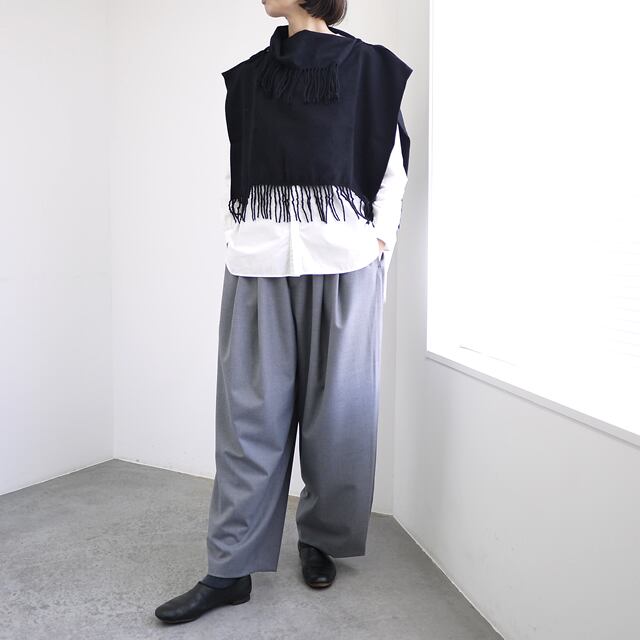 ハイネックの片側にスリットを入れた、フリンジ使いが特徴的なウールビエラのネックウォーマーです。暖かみのあるウールビエラ素材を使用し、フリンジがコーディネートに動きと表情を加えます。