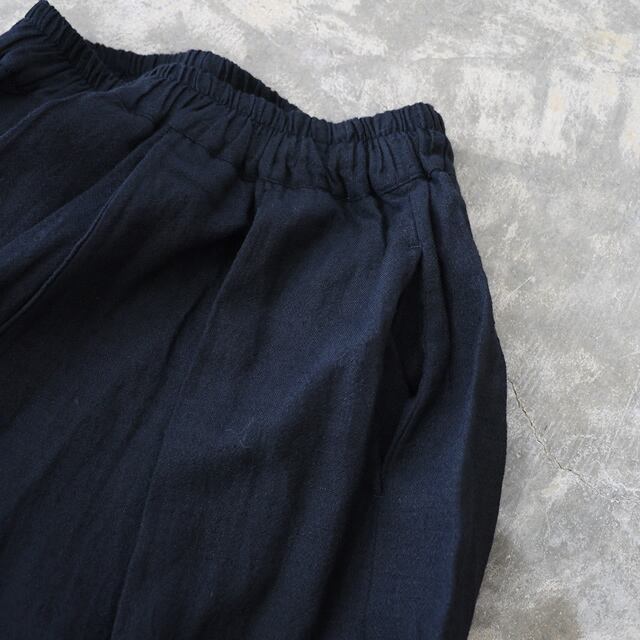 ウールとリネンが混紡された生地は、柔らかなウールのドレープ感とリネンの軽やかさが合わさり、立体感のあるナチュラルな落ち感を生み出します。