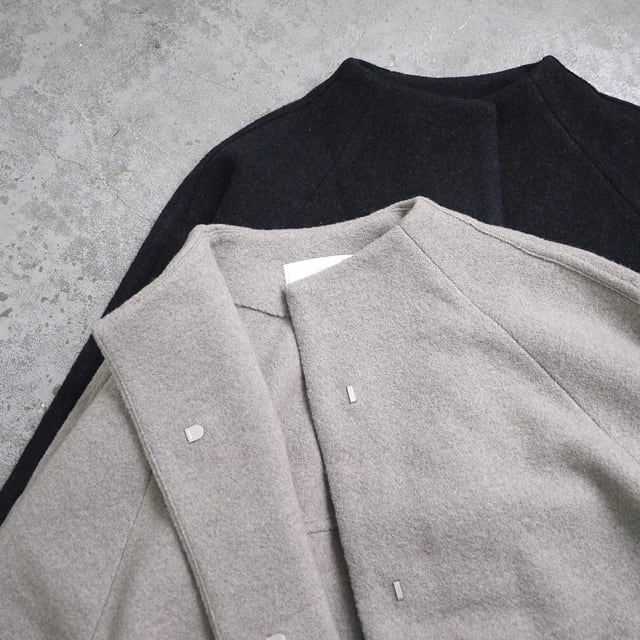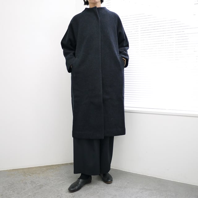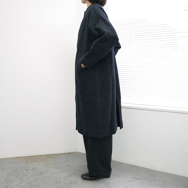 少し立ち上がったネックラインとゆったりと長めの着丈が、上品な雰囲気を演出。素材本来の風合いと暖かさを最大限に感じていただくため、裏地のない仕様になっています。インナーにニットなどを重ねることで、真冬にも十分な暖かさで着ていただける、シンプルで上質な一着です。