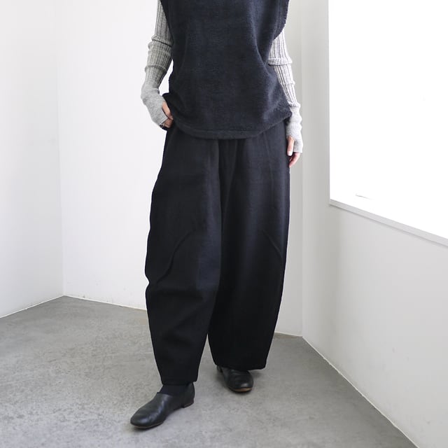 ウエストはゴムと内紐のイージー仕様で、リラックスした穿き心地。両サイドにシームポケット、ヒップポケットも1つ付いています。股上が深くワタリもゆとりのあるワイドなシルエットを、裾にダーツをとり緩やかに絞ることで丸みのあるシルエットに仕上げています。