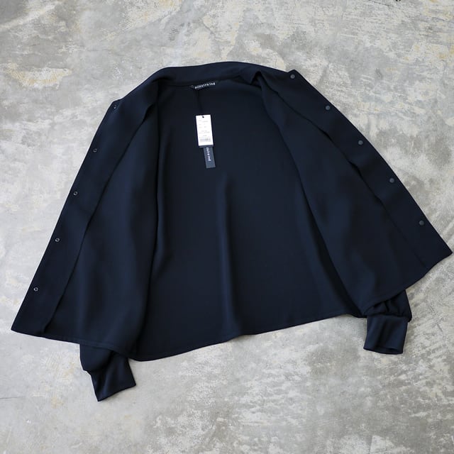 スタジアムジャンパーをベースに、カーディガンのように気軽に羽織れるデザインに仕上げた、ブルゾンライクなシャツです。程よくゆとりのあるサイズ感でありながら、シルエットはすっきりと整えられ、モードな印象を引き立てます。カジュアルな要素を取り入れつつも、上品で落ち着いた雰囲気を纏う一着です。