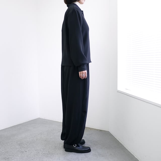 素材には、ふくらみと程よいハリ感を併せ持つダブルクロスを使用。しなやかで上品な質感が特徴で、防シワ性に優れ、ストレッチ性もあるため動きやすく快適な着心地です。程よい落ち感があり、身体のラインを美しく見せるドレープ感も魅力。