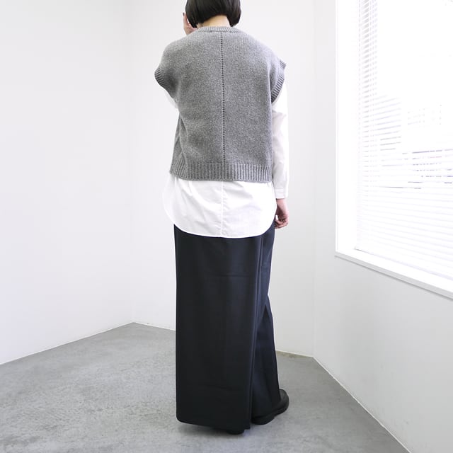 秋にはカットソーやシャツなどに、また冬にはコートインに合わせていただくとコーディネートのポイントになるアイテムです。後ろ中心に入ったさりげないタック柄もデザインのアクセントになっています。