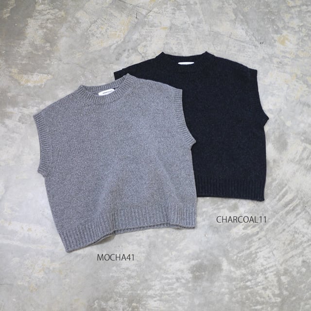 カシミヤ混のふくらみがあり、柔らかであたたかみのある素材を使用したホールガーメントニットのクルーネックショートベストです。撚り杢で撚糸したミックスカラーを多本取りし、インクリーズモードで3G風に編み立てることで、豊かな表情を加えています。
