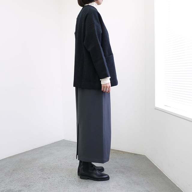 柔らかなウール糸で編んだニット地を圧縮することで、しっかりとしたハリのある生地に仕上げられています。ゆったりとした着心地で気軽に羽織れるデザインながら、少し立ち上がったネックラインが上品な印象を与えます。