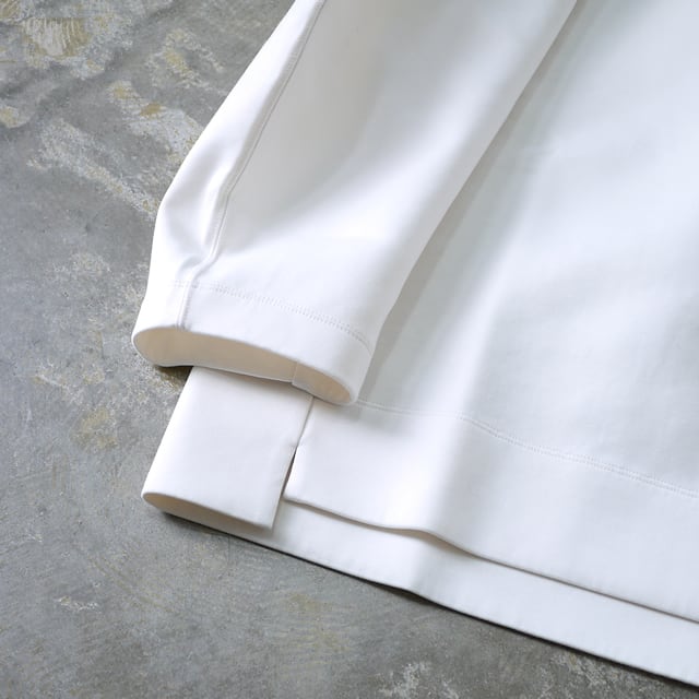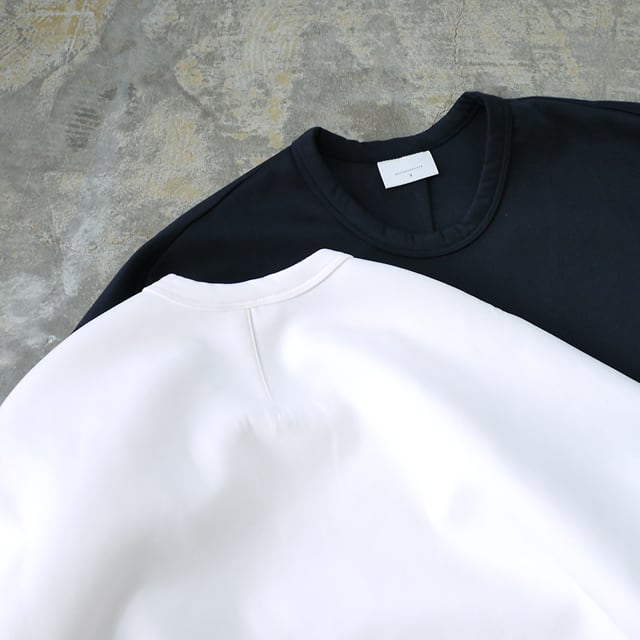 ポリエステル糸でしっかりと編み立てたダンボールニットを使用したオーバーサイズプルオーバーです。ポリウレタン糸を引き揃えているため、ダンボールニットとしてはしっかりとしたハリのある風合いに仕上がっています。