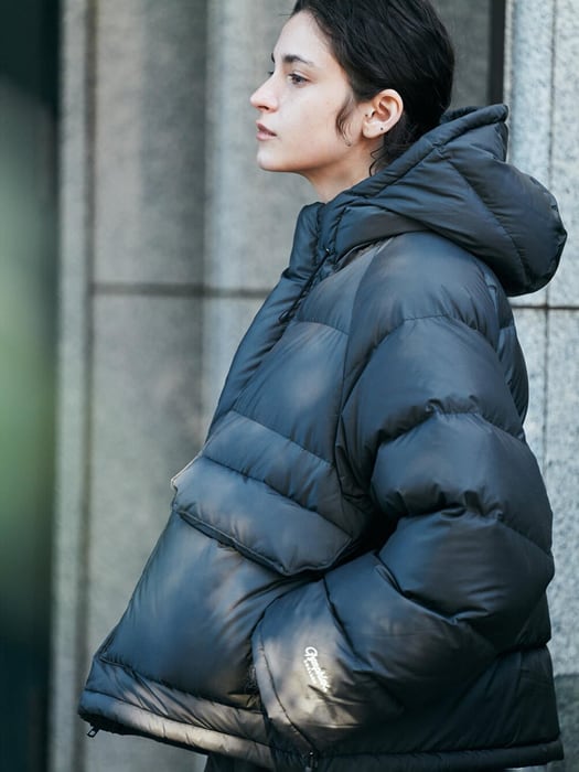ダウンの最高峰と呼ばれるホワイトグースダウンを使用した、軽さと膨らみが特徴のダウンフードジャケットです。生地には、国内有数のテキスタイルメーカーが作るナイロンタフタを採用。コットンのように自然な風合いを表現するため、後加工を付した糸を使用し、染色工程で揉み加工を施すことで、より自然な洗いざらし感とマットな表情を持つタフタに仕上げてます。