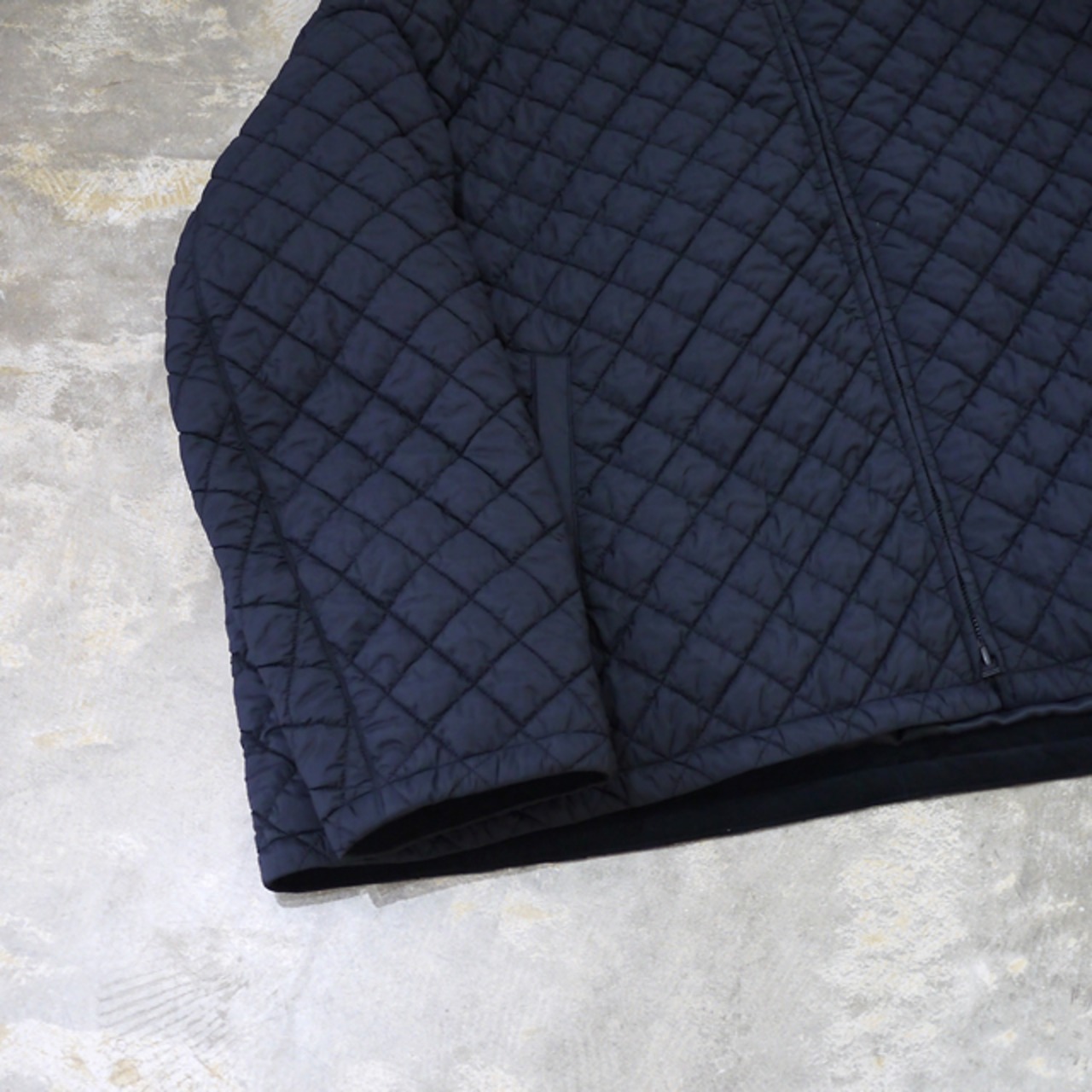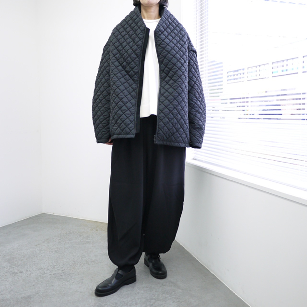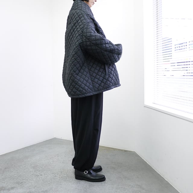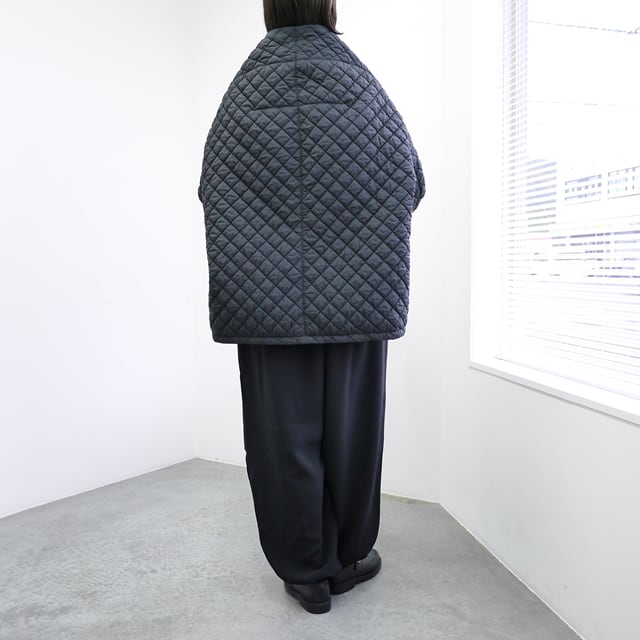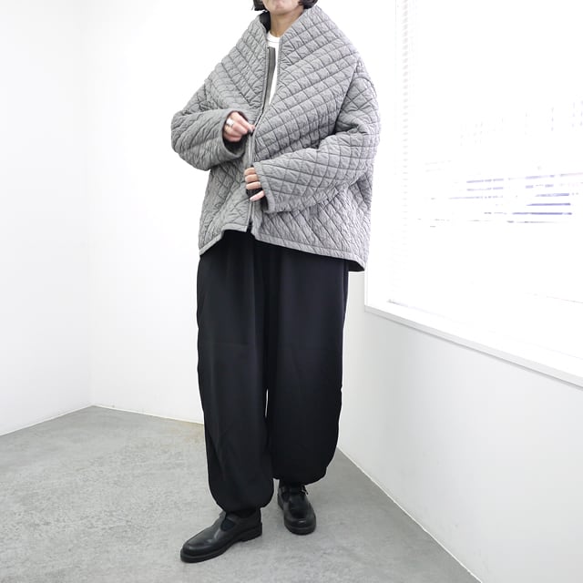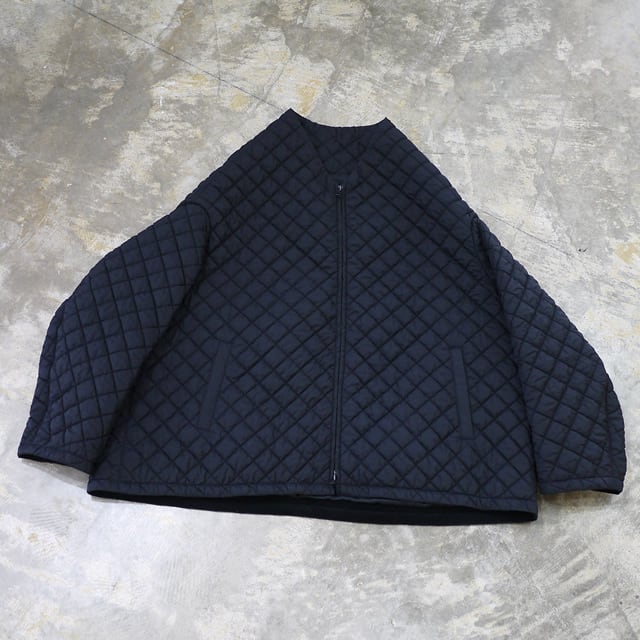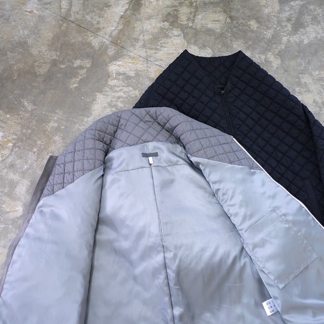 このブルゾンのポイントは、その軽さとユニークなデザインです。熱をかけると縮む生地を内側に挟み込み、キルティング後に熱入れ加工を施すことで、大きく膨らみを出しています。この工夫により、厚みの割にとても軽量で着やすいキルティングに仕上がっています。