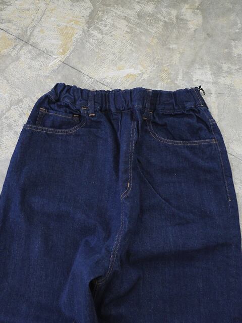 すっきりとしたベーシックなシルエットでありながら、ウエストはゴム紐で非常に楽な穿き心地を実現しています。また、コットン100%のデニム生地に製品洗いをかけることで、柔らかく優しい肌触りに仕上げています。