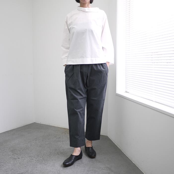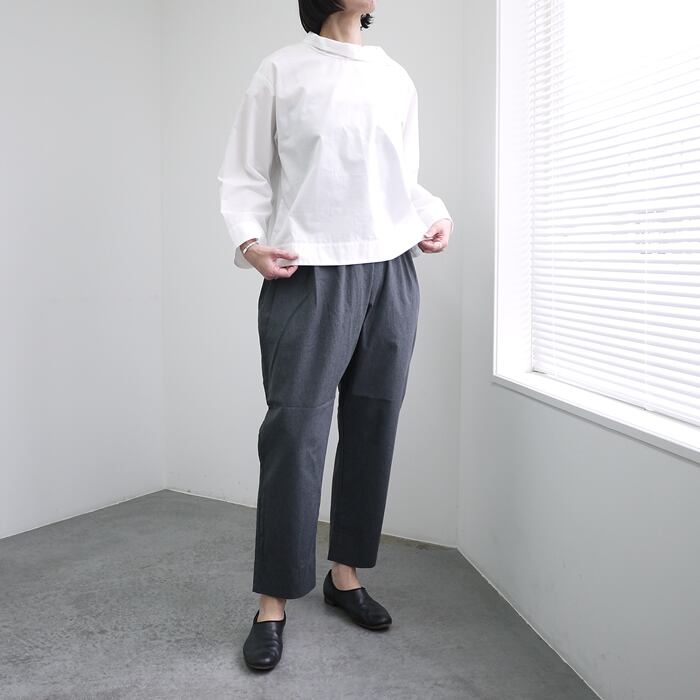 裾に施された幅広の切り替えが、シンプルな中にさりげないアクセントをプラス。素材には、清潔感のある張りのあるコットンシャツ素材を使用しており、凛とした佇まいを叶えてくれます。