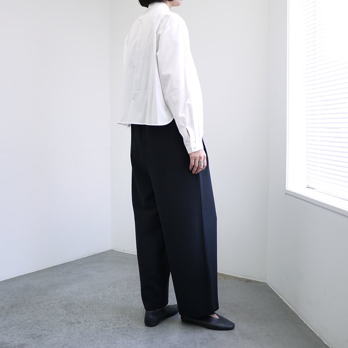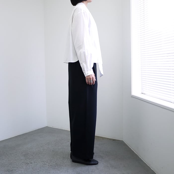 素材には、清潔感のある張りのあるコットンシャツ素材を使用。上品な佇まいと着回し力の高さを兼ね備えた、ワードローブの主役になる一枚です。