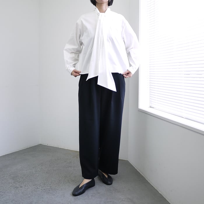 襟部分を長いタイでデザインした、表情豊かなロングタイカラーシャツです。タイの結び方次第で雰囲気を自由に変えられ、一枚着としてはもちろん、ニットやベストとのレイヤードスタイルでも幅広く活躍します。