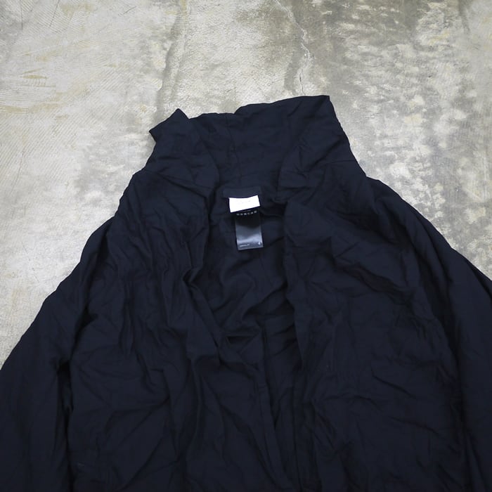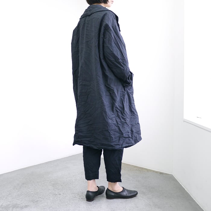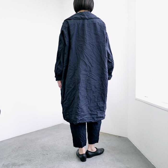 ポリエステル製品染めならではの特性として、色やロットごとに異なる独特のシワ感や質感があり、一着ごとに異なる豊かな表情を楽しめます。ボタンまで同色に染め上げたミニマルな仕上がりは、洗練された大人の日常に寄り添います。