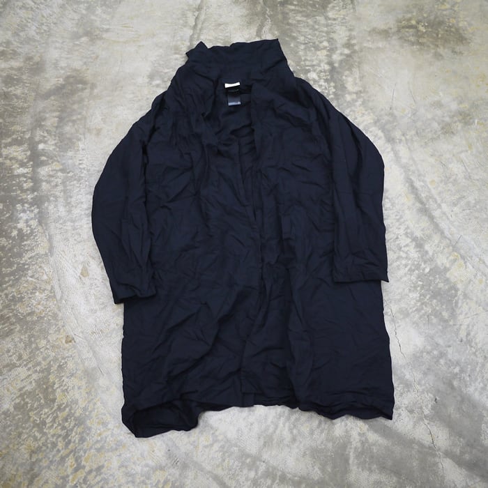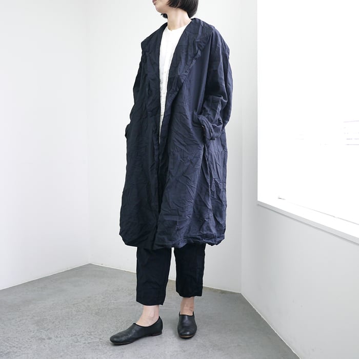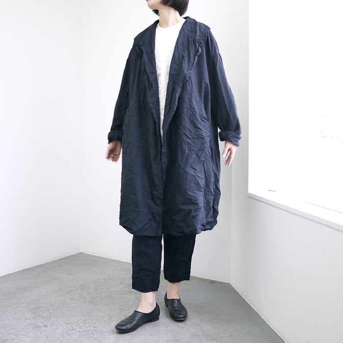ゆったりとしたオーバーサイズのシルエットに、上品なショールカラーを組み合わせたデザイン。同色の裏地が付いた総裏仕立てでありながら、表地と同じ生地を使用しているため、軽やかな着心地を保っています。