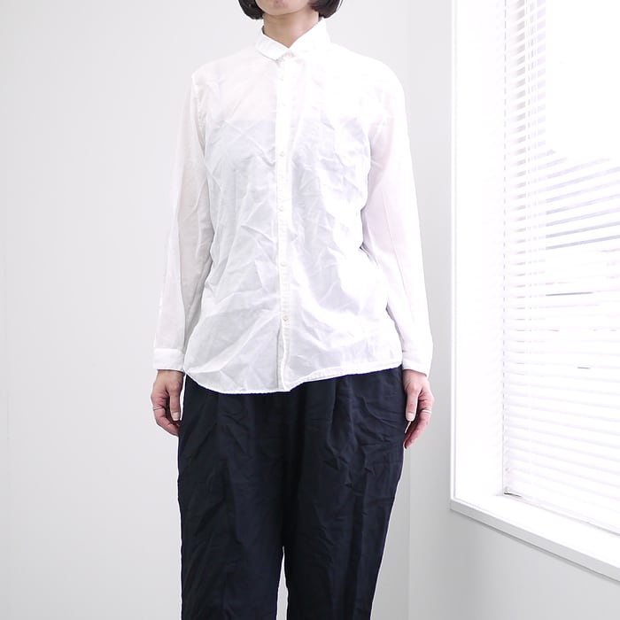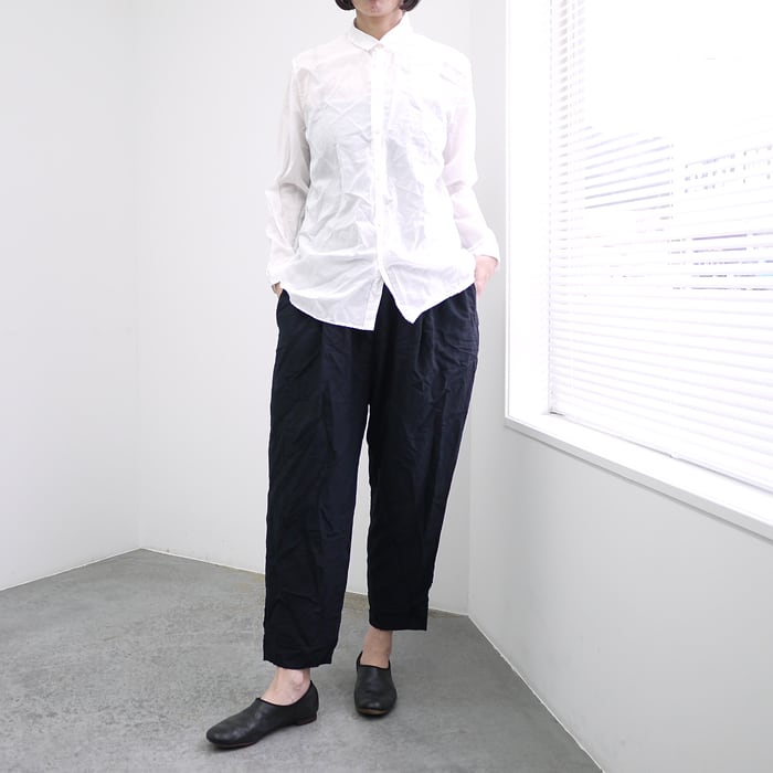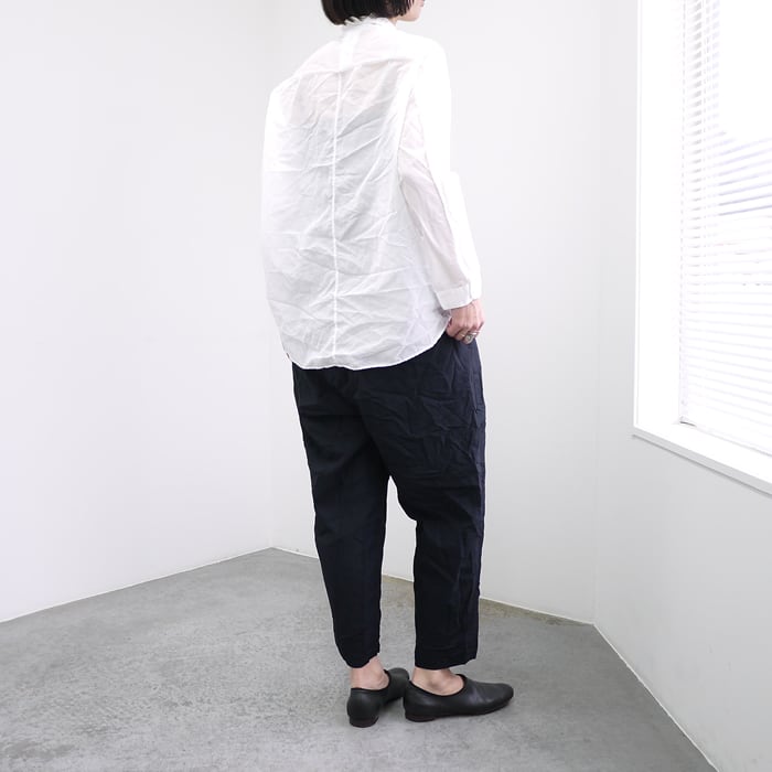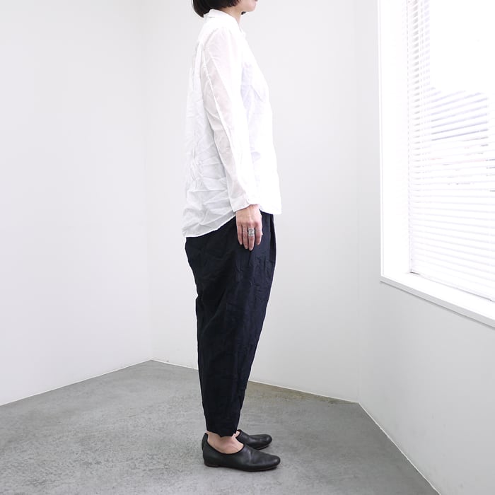 製品染めならではの絶妙なシワ感や、ニュアンスのある表情が魅力。すっきりとしたシルエットでありながら、さらりとした肌触りで快適に過ごせる、実用性とデザイン性を兼ね備えたアイテムです。