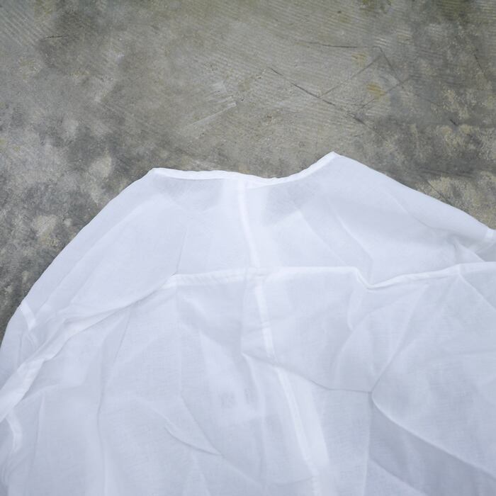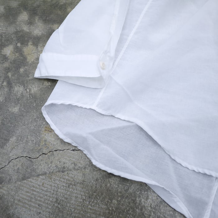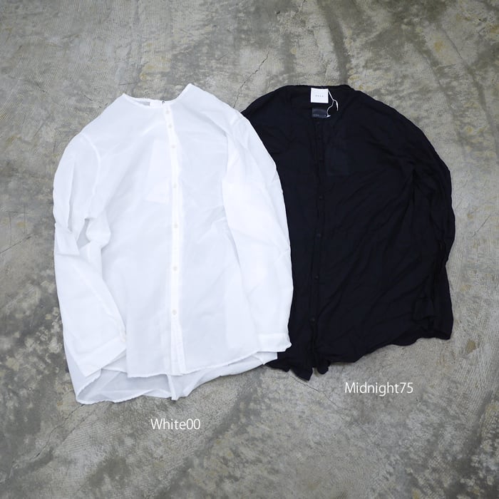 顔まわりをすっきりと見せるノーカラーのデザインが印象的な、ヨークシャツです。肩のラインを美しく整えるジャストなサイズ感に加え、フロントは別前立ての仕様を採用。細部までこだわりを感じさせる、シンプルながらも凛とした表情に仕上げられています。